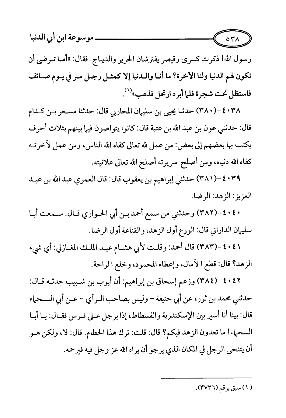 381 - حَدَّثَنِي إِبْرَاهِيمُ بْنُ يَعْقُوبَ، قَالَ: قَالَ الْعُمَرِيُّ عَبْدُ اللَّهِ بْنُ عَبْدِ الْعَزِيزِ: الزُّهْدُ: الرِّضَا.