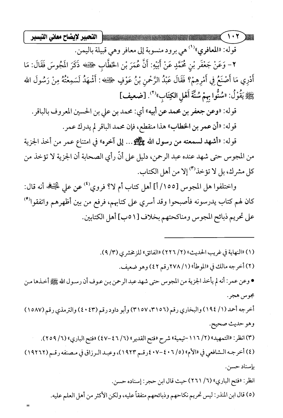 2 - وَعَنْ جَعْفَر بْنٍ مُحَمَّدٍ عَنْ أَبَيْهِ: أَنَّ عُمَرَ بْن الخَطَّابِ - رضي الله عنه - ذَكَرَ المَجُوسَ فَقَالَ: مَا أَدْرِي مَا أَصْنَعُ فِي أَمْرِهِمْ؟ فَقَالَ عَبْدُ الرَّحْمنِ بْنُ عَوْفٍ - رضي الله عنه -: أَشْهَدُ لَسَمِعْتُهُ مِنْ رَسُولَ الله - صلى الله عليه وسلم - يَقُوْلُ: "سُنُّوا بِهِمْ سُنَّةَ أَهْلِ الكِتَابِ" (¬2). [ضعيف]