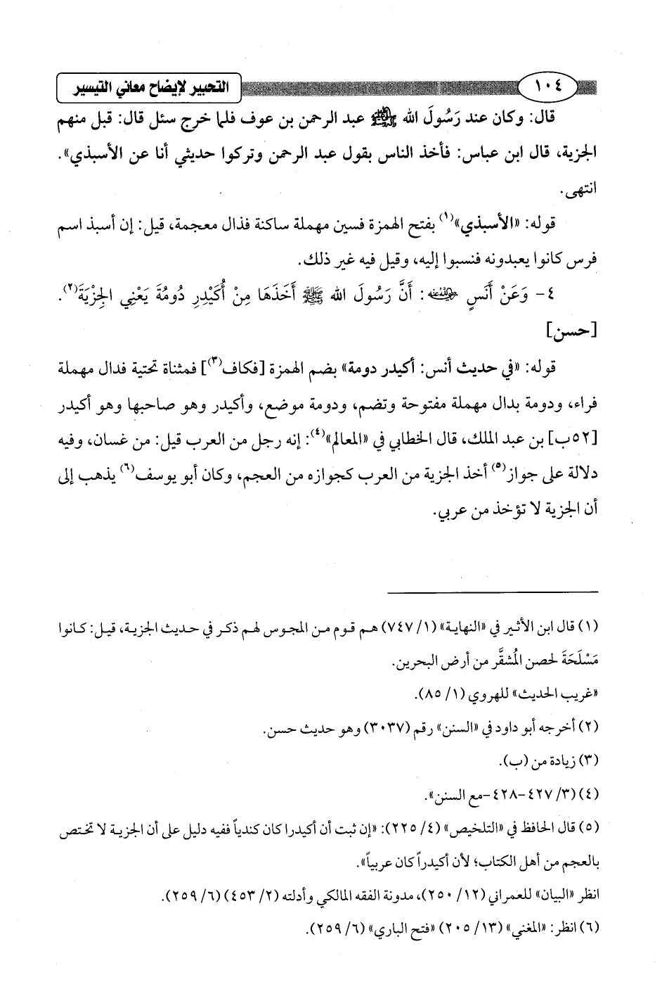 قال: وكان عند رَسُولَ الله - صلى الله عليه وسلم - عبد الرحمن بن عوف فلما خرج سئل قال: قبل منهم الجزية, قال ابن عباس: فأخذ الناس بقول عبد الرحمن وتركوا حديثي أنا عن الأسبذي". انتهى.