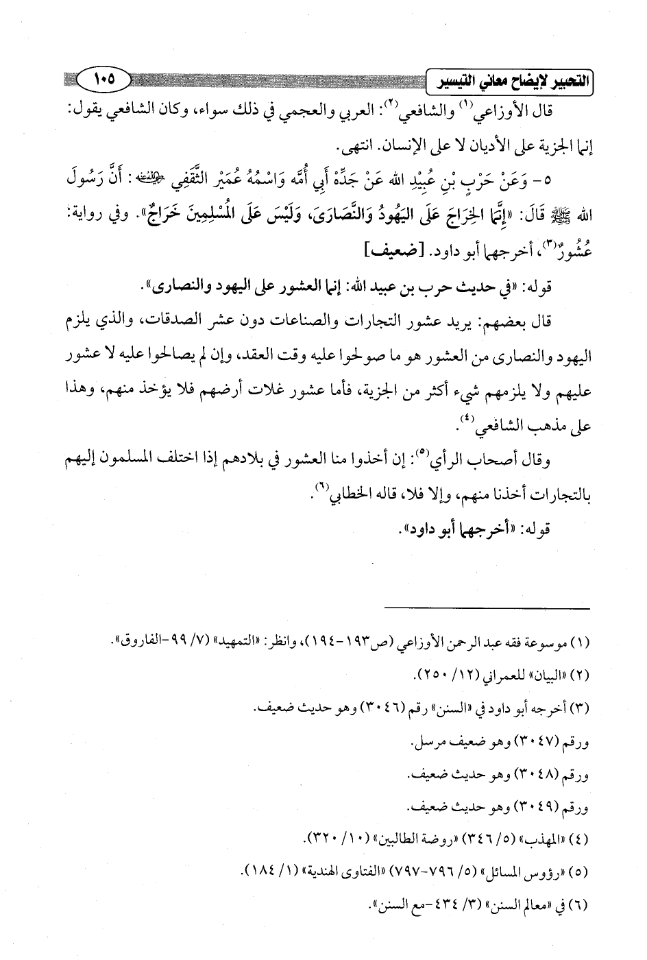 قال بعضهم: يريد عشور التجارات والصناعات دون عشر الصدقات، والذي يلزم اليهود والنصارى من العشور هو ما صولحوا عليه وقت العقد، وإن لم يصالحوا عليه لا عشور عليهم ولا يلزمهم شيء أكثر من الجزية, فأما عشور غلات أرضهم فلا يؤخذ منهم، وهذا على مذهب الشافعي (¬4).