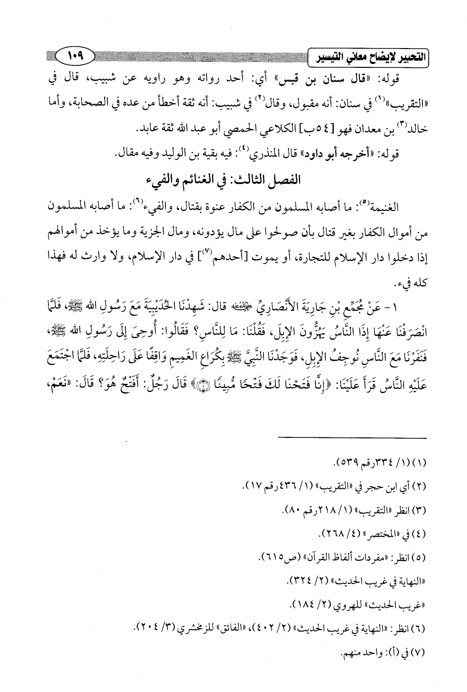 1 - عَنْ مُجَمِّعِ بْنِ جَارِيَةَ الأَنْصارِيِّ - رضي الله عنه - قال: شَهِدْنَا الحُدَيْبِيَةَ مَعَ رَسُولِ الله - صلى الله عليه وسلم -، فَلَمَّا انْصَرَفْنَا عَنْهَا إِذَا النَّاسُ يَهُزُّونَ الإِبِلَ، فَقُلْنَا: مَا لِلنَّاسِ؟ فَقَالُوا: أُوحِىَ إِلَى رَسُولِ الله - صلى الله عليه وسلم -، فَنَفَرْنَا مَعَ النَّاسِ نُوجِفُ الإِبِلِ، فَوَجَدْنَا النَّبِيَّ - صلى الله عليه وسلم - بِكُرَاعِ الغَمِيمِ وَاقِفًا عَلَى رَاحِلَتِهِ، فَلمَّا اجْتَمَعَ عَلَيْهِ النَّاسُ قَرَأَ عَلَيْنَا: {إِنَّا فَتَحْنَا لَكَ فَتْحًا مُبِينًا (1)} قَالَ رَجُلٌ: أَفَتْحٌ هُوَ؟ قَالَ: "نَعَمْ،
