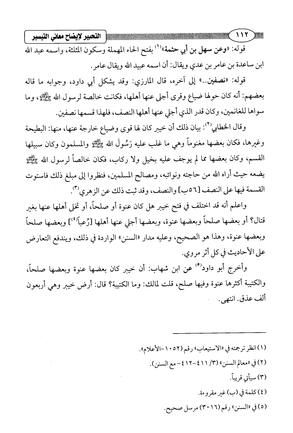 وقال الخطابي (¬2): بيان ذلك أن خيبر كان لها قوى وضياع خارجة عنها، منها: البطيحة وغيرها، فكان بعضها مغنوماً وهي ما غلب عليه رَسُولَ الله - صلى الله عليه وسلم -والمسلمون وكان سبيلها القسم، وكان بعضها مما لم يوجف عليه بخيل ولا ركاب، فكان خالصاً لرسول الله - صلى الله عليه وسلم - يضعه حيث أراه الله من حاجته ونوائبه، ومصالح المسلمين، فنظروا إلى مبلغ ذلك فاستوت القسمة فيها على النصف [56 ب] والنصف، وقد ثبت ذلك عن الزهري (¬3).