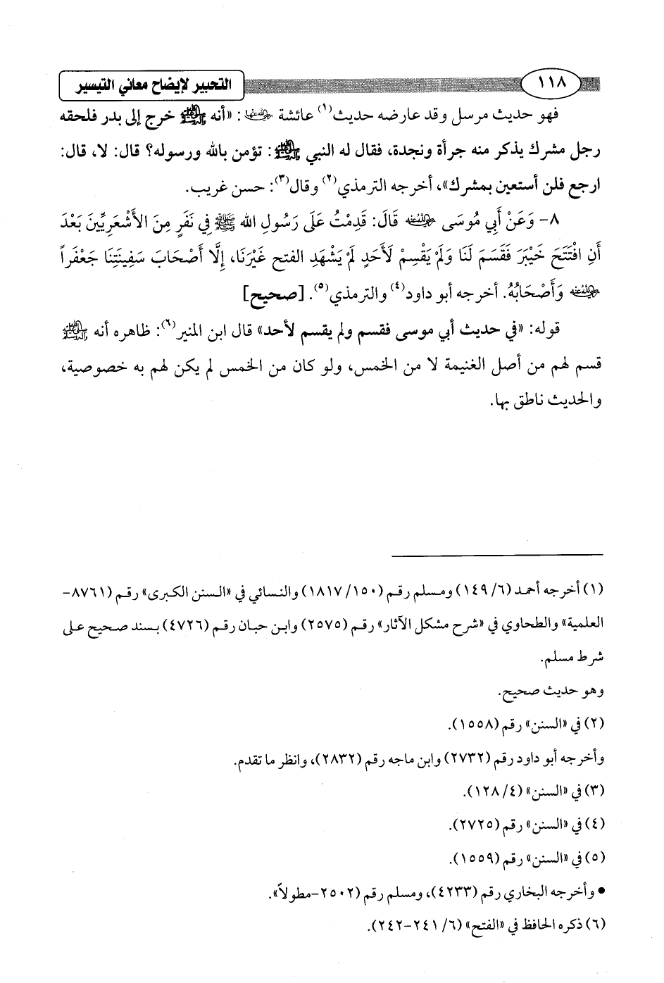 8 - وَعَنْ أَبِي مُوسَى - رضي الله عنه - قَالَ: قَدِمْتُ عَلَى رَسُولِ الله - صلى الله عليه وسلم - في نَفَرٍ مِنَ الأَشْعَرِيِّينَ بَعْدَ أَنِ افْتَتَحَ خَيْبَرَ فَقَسَمَ لَنَا وَلَمْ يَقْسِمْ لَأَحَدٍ لَمْ يَشْهَدِ الفتح غَيْرَنَا، إِلَّا أَصْحَابَ سَفِينَتِنَا جَعْفَراً - رضي الله عنه - وَأَصْحَابُهُ. أخرجه أبو داود (¬4) والترمذي (¬5). [صحيح]