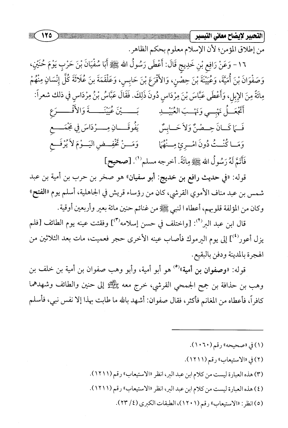 16 - وَعَنْ رَافِعِ بْنِ خَدِيجٍ قَالَ: أَعْطَى رَسُولُ الله - صلى الله عليه وسلم - أَبَا سُفْيَانَ بْنَ حَرْبٍ يَوْمَ حُنَيْنٍ، وَصَفْوَانَ بْنَ أُمَيَّةَ، وَعُيَيْنَةَ بْنَ حِصْنٍ، وَالأَقْرَعَ بْنَ حَابِسٍ، وَعَلْقَمَةَ بنَ عُلَاثَةَ كُلَّ إِنْسَانٍ مِنْهُمْ مِائَةً مِنَ الإِبِلِ، وَأَعْطَى عَبَّاسَ بْنَ مِرْدَاسٍ دُونَ ذَلِكَ. فَقَالَ عَبَّاسُ بْنُ مِرْدَاسٍ في ذلك شعراً: