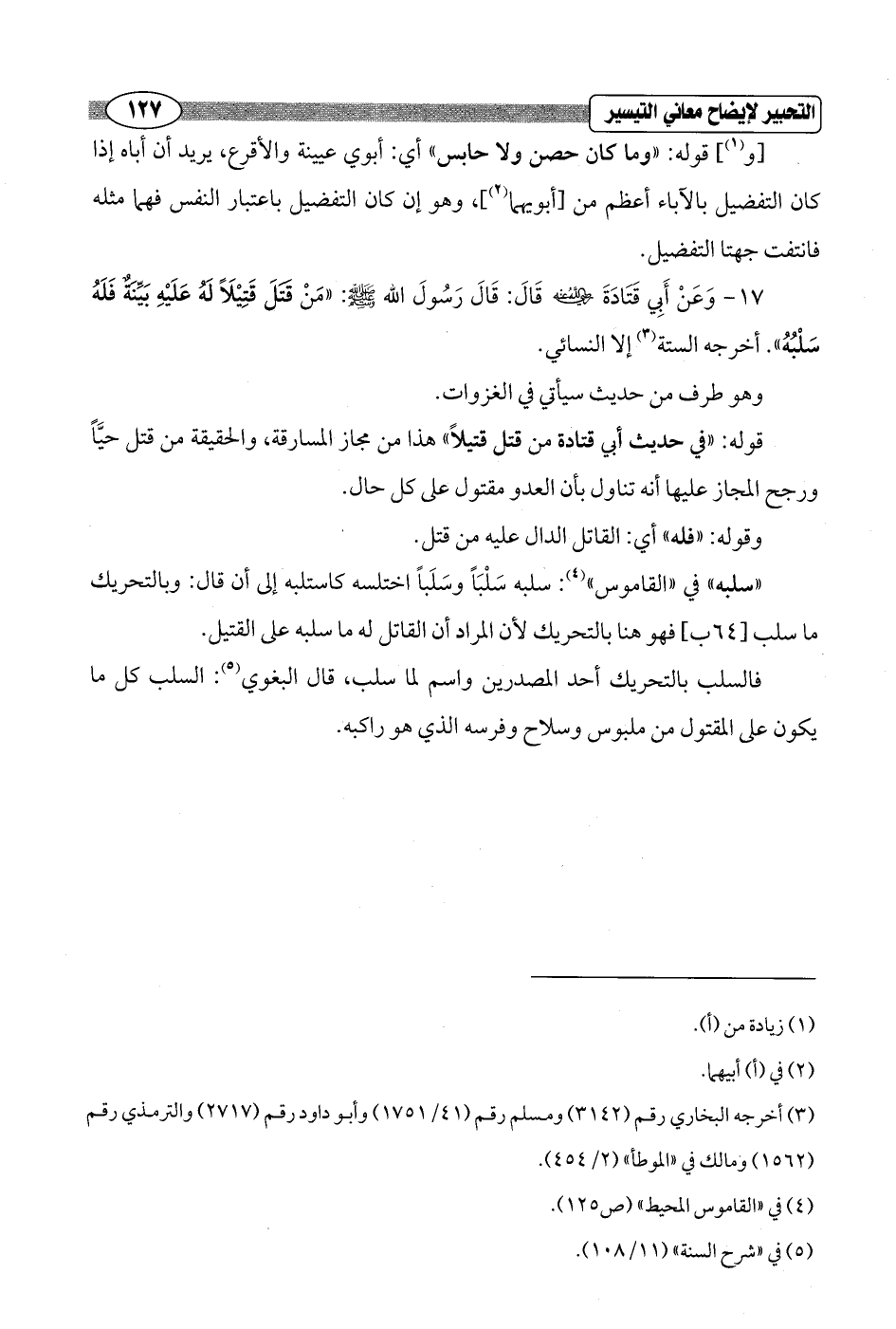 "سلبه" في "القاموس" (¬4): سلبه سَلْبَاً وسَلَباً اختلسه كاستلبه إلى أن قال: وبالتحريك ما سلب [64 ب] فهو هنا بالتحريك لأن المراد أن القاتل له ما سلبه على القتيل.