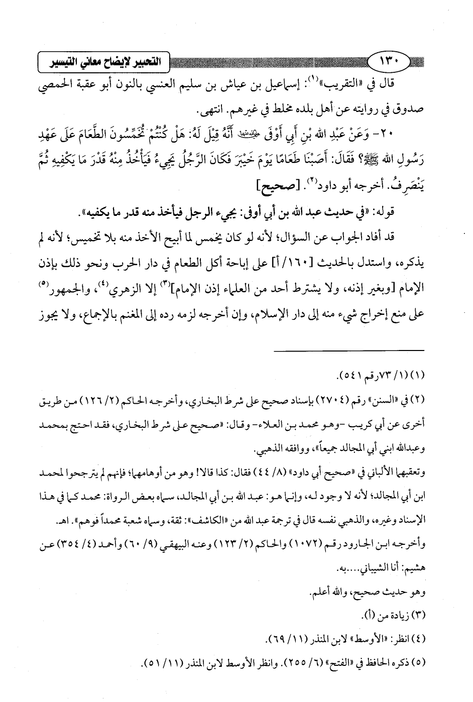 20 - وَعَنْ عَبْدِ الله بْنِ أَبِي أَوْفَى - رضي الله عنهما - أَنَّهُ قِيْلَ لَهُ: هَلْ كُنْتُمْ تُخَمِّسُونَ الطَّعَامَ عَلَى عَهْدِ رَسُولِ الله - صلى الله عليه وسلم -؟ فَقَالَ: أَصَبْنَا طَعَامًا يَوْمَ خَيْبَرَ فكَانَ الرَّجُلُ يَجِيءُ فَيَأْخُذُ مِنْهُ قَدْرَ مَا يَكْفِيهِ ثُمَّ يَنْصَرِفُ. أخرجه أبو داود (¬2). [صحيح]