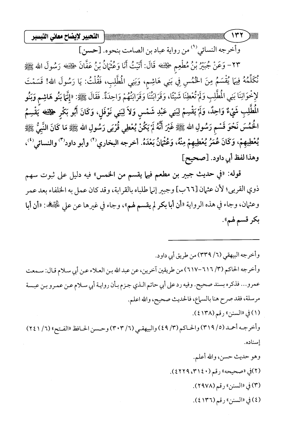 23 - وَعَنْ جُبَيْرُ بْنُ مُطْعِمٍ - رضي الله عنه - قَالَ: أَتَيْتُ أَنَا وَعُثْمَانُ بْنُ عَفَّانَ - رضي الله عنه -رَسُولَ الله - صلى الله عليه وسلم - نُكَلِّمُهُ فِيمَا يُقْسَمُ مِنَ الخُمُسِ فِي بَنِي هَاشِمٍ، وَبَنِي المُطَّلِبِ، فَقُلْتُ: يَا رَسُولَ الله! قَسَمْتَ لإِخْوَانِنَا بَنِي المُطَّلِبِ وَلَمْ تُعْطِنَا شَيْئًا، وَقَرَابَتُنَا وَقَرَابَتُهُمْ وَاحِدَةٌ. فَقَالَ - صلى الله عليه وسلم -: "إِنَّمَا بَنُو هَاشِمٍ وَبَنُو المُطَّلِبِ شَيْءٌ وَاحِدٌ، وَلَمْ يَقْسِمْ لِبَنِي عَبْدِ شَمْسٍ وَلاَ لِبَني نَوْفَلٍ، وَكَانَ أَبُو بَكْرٍ - رضي الله عنه - يَقْسِمُ الخُمُسَ نَحْوَ قَسْمِ رَسُولِ الله - صلى الله عليه وسلم - غَيْرَ أَنَّهُ لَمْ يَكُنْ يُعْطِي قُرْبَى رَسُولِ الله - صلى الله عليه وسلم - مَا كَانَ النَّبِيُّ - صلى الله عليه وسلم - يُعْطِيهِمْ، وَكَانَ عُمَرُ يُعْطِيهِمْ مِنْهُ، وَعُثْمَانُ بَعْدَهُ. أخرجه البخاري (¬2) وأبو داود (¬3) والنسائي (¬4)، وهذا لفظ أبي داود. [صحيح]