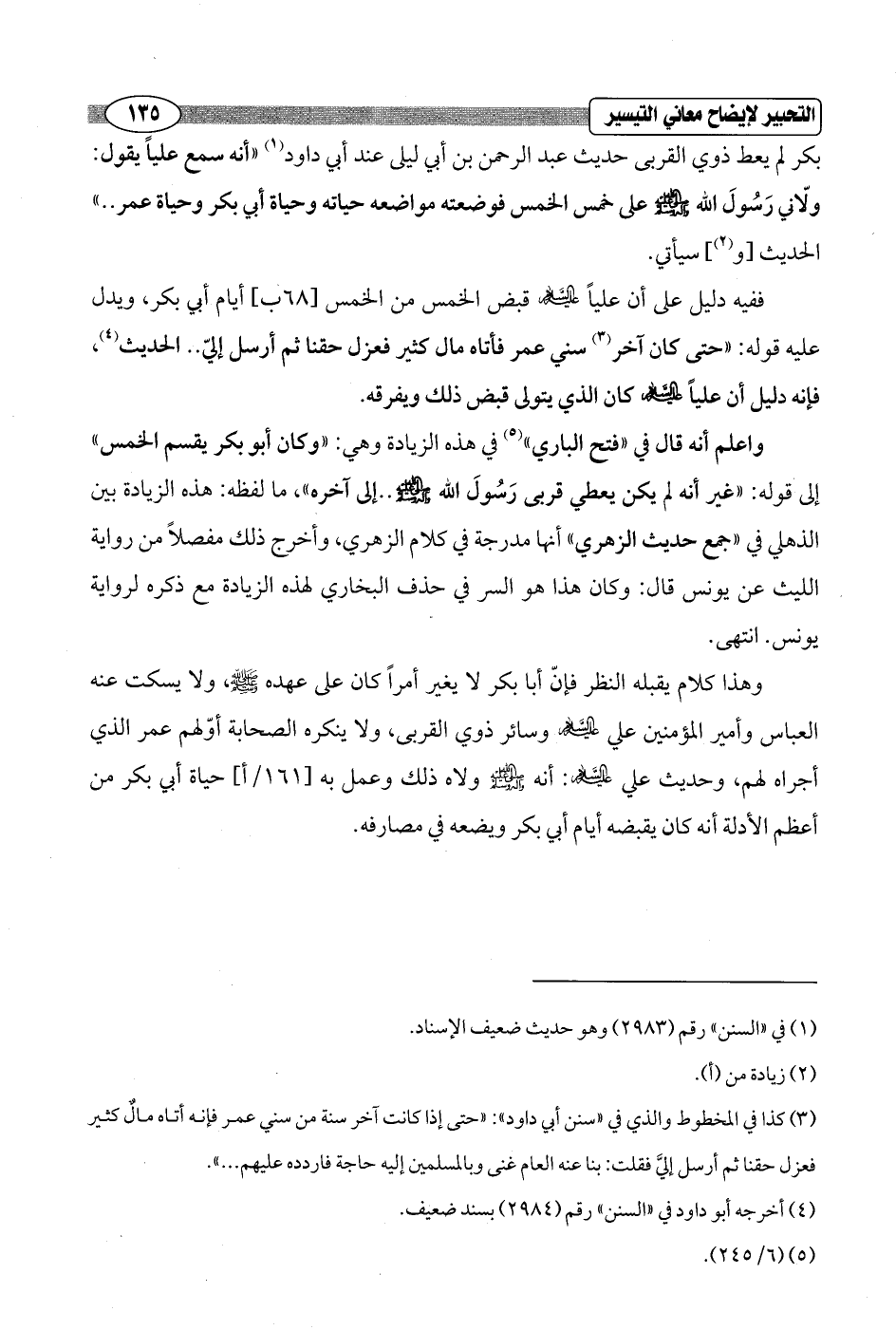 وهذا كلام يقبله النظر فإنّ أبا بكر لا يغير أمراً كان على عهده - صلى الله عليه وسلم -، ولا يسكت عنه العباس وأمير المؤمنين علي - عليه السلام - وسائر ذوي القربى، ولا ينكره الصحابة أوّلهم عمر الذي أجراه لهم، وحديث علي - عليه السلام -: أنه - صلى الله عليه وسلم - ولاه ذلك وعمل به [161/ أ] حياة أبي بكر من أعظم الأدلة أنه كان يقبضه أيام أبي بكر ويضعه في مصارفه.