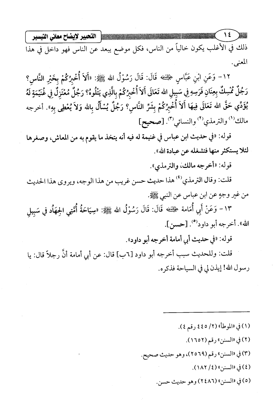 12 - وَعَنِ ابْنِ عَبَّاسٍ - رضي الله عنه - قَالَ: قَالَ رَسُوْلُ الله - صلى الله عليه وسلم -: "أَلاَ أُخْبِرُكُمْ بِخَيْرِ النَّاسِ؟ رَجُلٌ مُمْسِكٌ بِعِنَانِ فَرَسِهِ فِي سَبِيلِ الله تَعَالَى أَلاَ أُخْبِرُكُمْ بِالَّذِي يَتْلُوهُ؟ رَجُلٌ مُعْتَزِلٌ فِي غُنَيْمَةٍ لَهُ يُؤَدِّي حَقَّ الله تَعَالَى فِيهَا أَلاَ أُخْبِرُكُمْ بِشَرِّ النَّاسِ؟ رَجُلٌ يُسْأَلُ بِالله وَلاَ يُعْطِى بِه". أخرجه مالك (¬1) والترمذي (¬2) والنسائي (¬3). [صحيح]