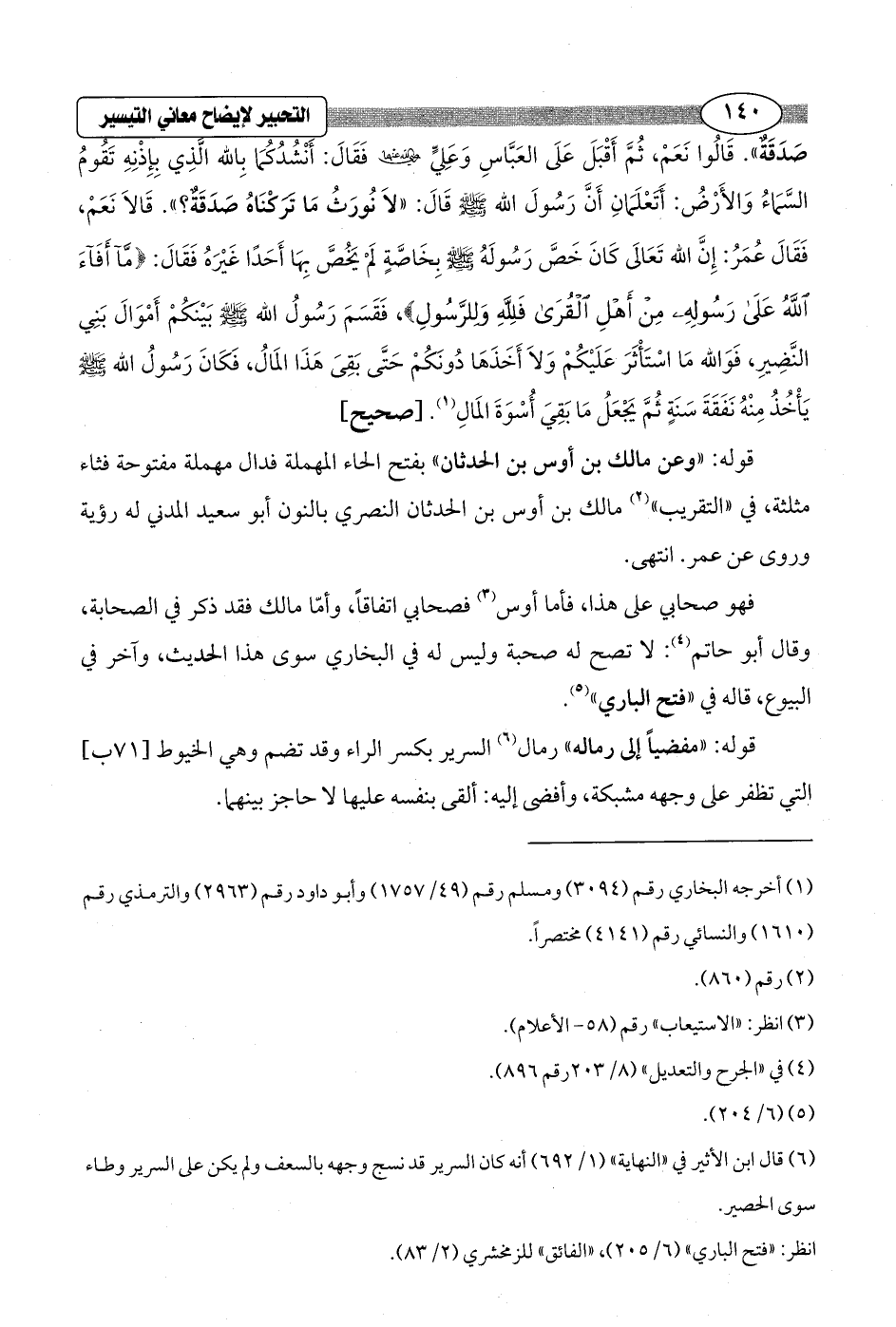 قوله: "وعن مالك بن أوس بن الحدثان" بفتح الحاء المهملة فدال مهملة مفتوحة فثاء مثلثة، في "التقريب" (¬2) مالك بن أوس بن الحدثان النصري بالنون أبو سعيد المدني له رؤية وروى عن عمر. انتهى.
