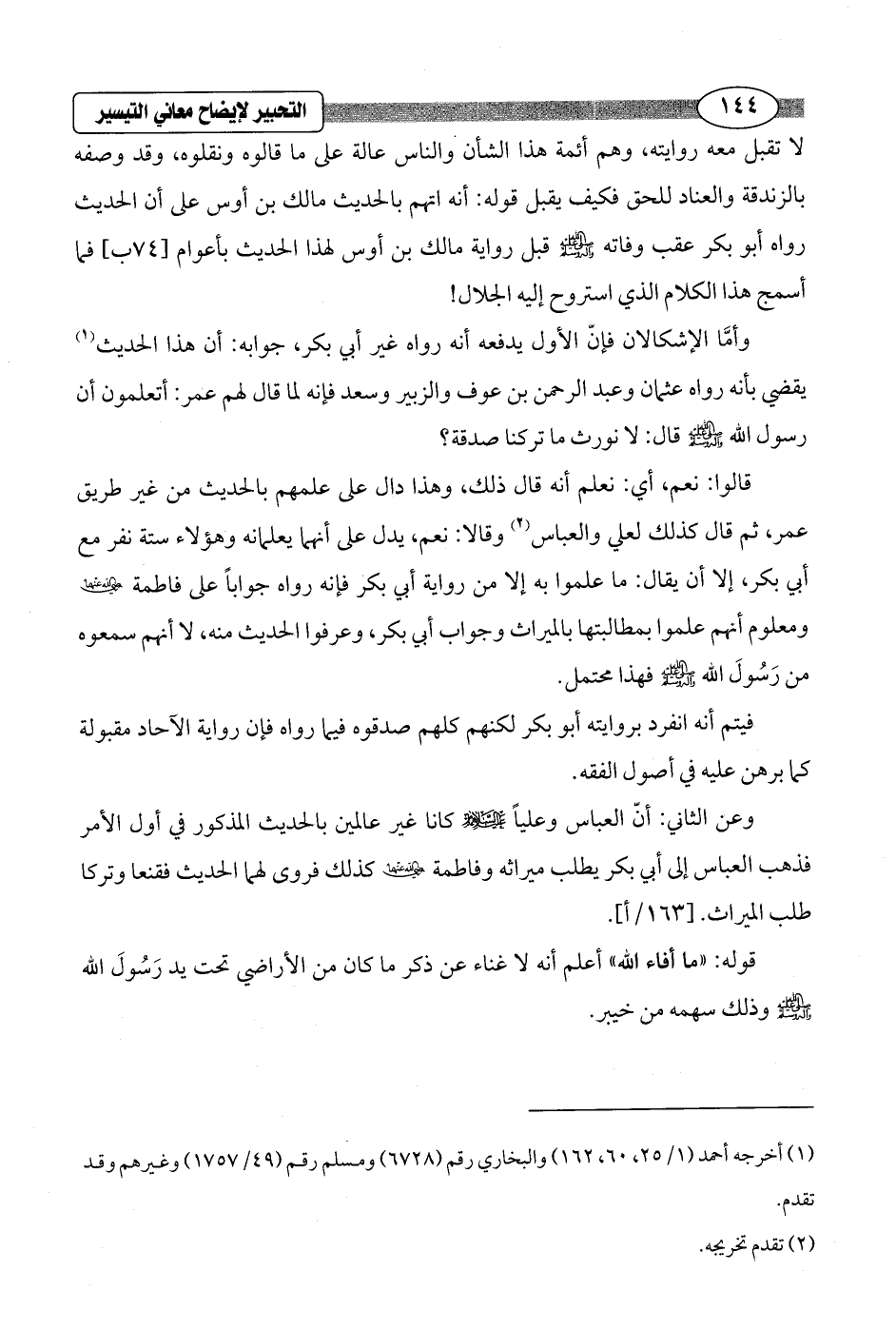 وعن الثاني: أنّ العباس وعلياً - عليهما السلام - كانا غير عالمين بالحديث المذكور في أول الأمر فذهب العباس إلى أبي بكر يطلب ميراثه وفاطمة - رضي الله عنها - كذلك فروى لهما الحديث فقنعا وتركا طلب الميراث. [163/ أ].