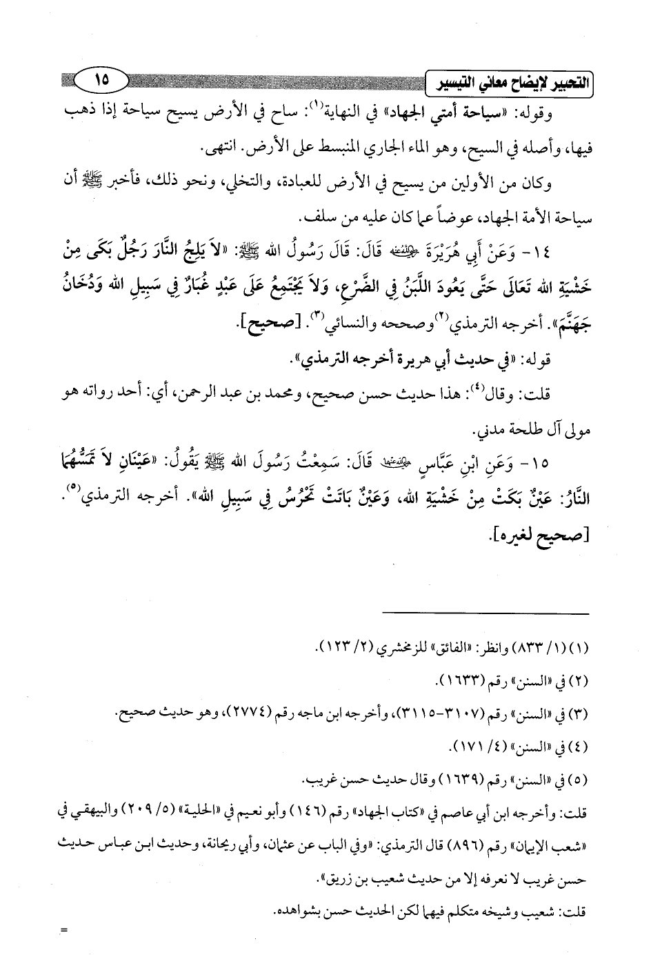 15 - وَعَنِ ابْنِ عَبَّاسٍ - رضي الله عنهما - قَالَ: سَمِعْتُ رَسُولَ الله - صلى الله عليه وسلم - يَقُولُ: "عَيْنَانِ لاَ تَمَسُّهُمَا النَّارُ: عَيْنٌ بَكَتْ مِنْ خَشْيَةِ الله، وَعَيْنٌ بَاتَتْ تَحْرُسُ فِي سَبِيلِ الله". أخرجه الترمذي (¬5). [صحيح لغيره].
