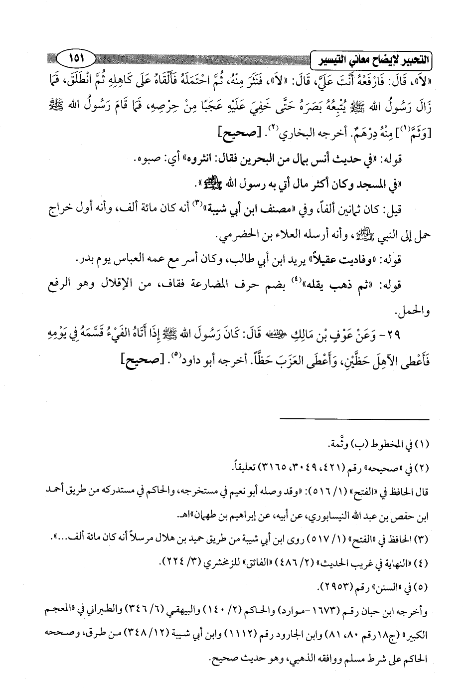 29 - وَعَنْ عَوْفٍ بن مَالِكِ - رضي الله عنه - قَالَ: كَانَ رَسُولَ الله - صلى الله عليه وسلم -إِذَا أَتَاهُ الفَيْءُ قَسَّمَهُ فِي يَوْمِهِ فَأَعْطى الآهِلَ حَظَّيْنِ، وَأَعْطَى العَزَبَ حَظَّاً. أخرجه أبو داود (¬5). [صحيح]