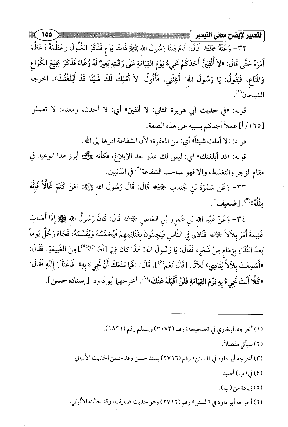 34 - وَعَنْ عَبْدِ اللهِ بْنِ عَمْرٍو بْنِ العَاصِ - رضي الله عنهما - قَالَ: كَانَ رَسُولُ الله - صلى الله عليه وسلم - إِذَا أَصَابَ غَنِيمَةً أَمَرَ بِلاَلاً - رضي الله عنه - فَنَادَى فِي النَّاسِ فَيَجِيئُونَ بِغَنَائِمِهِمْ فَيُخَمِّسُهُ وَيُقَسِّمُهُ، فًجَاءَ رَجُلٌ يَوماً بَعْدَ النِّدَاءِ بِزِمَامٍ مِنْ شَعَرٍ، فَقَالَ: يَا رَسُولَ الله! هَذَا كان فِيمَا [أَصَبْنَاهُ (¬4)] مِنَ الغَنِيمَةِ. فَقَالَ: "أَسَمِعْتَ بِلاَلاً يُنَادِي" ثَلاَثًا. [قَالَ نَعَمْ (¬5)]. قَالَ: "فما مَنَعَكَ أَنْ تَجِيءَ بِهِ". فَاعْتَذَرَ إِلَيْهِ فَقَالَ: "كَلَّا أنتَ تَجِيءُ بِهِ يَوْمَ القِيَامَةِ فَلَنْ أَقْبَلَهُ عَنْكَ" (¬6). أخرجهما أبو داود. [إسناده حسن].