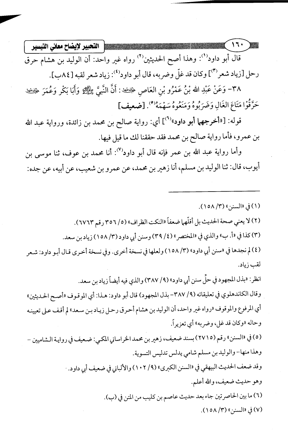 38 - وَعَنْ عَبْدِ الله بْنُ عمْرُو بْنِ العَاصِ - رضي الله عنهما -: أَنَّ النَّبيَّ - صلى الله عليه وسلم - وأَبا بَكْر وَعُمَرَ - رضي الله عنهما - حَرَّقُوْا مَتَاعَ الغَالِ وَضَرَبُوهُ وَمَنَعُوهُ سَهْمَهُ (¬5). [ضعيف]