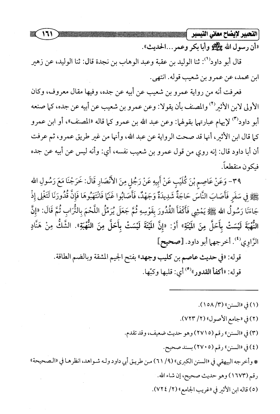 فعرفت أنه من رواية عمرو بن شعيب عن أبيه عن جده، وفيها مقال معروف، وكان الأولى لابن الأثير (¬2) والمصنف بأن يقولا: وعن عمرو بن شعيب عن أبيه عن جده، كما صنعه أبو داود (¬3) لإيهام عبارتهما بقولهما: وعن عبد الله بن عمرو كما قاله "المصنف"، أو ابن عمرو كما قال ابن الأثير، أنها قد صحت الرواية عن عبد الله، وأنها من غير طريق عمرو، ثم عرفت أن أبا داود قال: إنه روي من قول عمرو بن شعيب نفسه، أي: وأنه ليس عن أبيه عن جده فيكون منقطعاً.