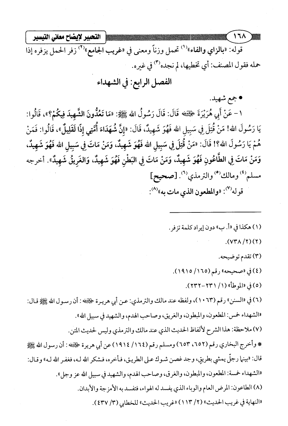 1 - عَنْ أَبِي هُرَيْرَةَ - رضي الله عنه - قَالَ: قَالَ رَسُولُ الله - صلى الله عليه وسلم -: "مَا تَعُدُّونَ الشَّهِيدَ فِيكُمْ؟ "، قَالُوا: يَا رَسُولَ الله؟! مَنْ قُتِلَ فِي سَبِيلِ الله فَهُوَ شَهِيدٌ, قَالَ: "إِنَّ شُهَدَاءَ أُمَّتِي إِذًا لَقَلِيلٌ"، قَالُوا: فَمَنْ هُمْ يَا رَسُولَ الله؟! قَالَ: "مَنْ قُتِلَ فِي سَبِيلِ الله فَهُوَ شَهِيدٌ، وَمَنْ مَاتَ فِي سَبِيلِ الله فَهُوَ شَهِيدٌ، وَمَنْ مَاتَ فِي الطَّاعُونِ فَهُوَ شَهِيدٌ، وَمَنْ مَاتَ فِي البَطْنِ فَهُوَ شَهِيدٌ، وَالغَرِيقُ شَهِيدٌ". أخرجه مسلم (¬4) ومالك (¬5) والترمذي (¬6) [صحيح]