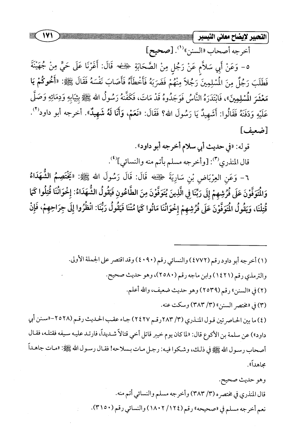 (¬4) ما بين الحاصرتين قول المنذري (3/ 283 رقم 2427) جاء عقب الحديث رقم (2528 - "سنن أبي داود") عن سلمة بن الأكوع قال: "لما كان يوم خيبر قاتل أخي قتالاً شديداً، فارتد عليه سيفه فقتله، فقال أصحاب رسول الله - صلى الله عليه وسلم - في ذلك، وشكوا فيه: رجل مات بسلاحه! فقال رسول الله - صلى الله عليه وسلم -: "مات جاهداً مجاهداً".