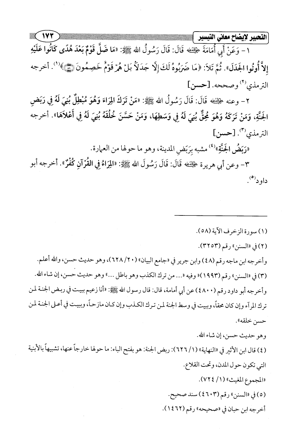 (¬3) في "السنن" رقم (1993) "وفيه " ... من ترك الكذب وهو باطل ... " وهو حديث حسن، إن شاء الله.