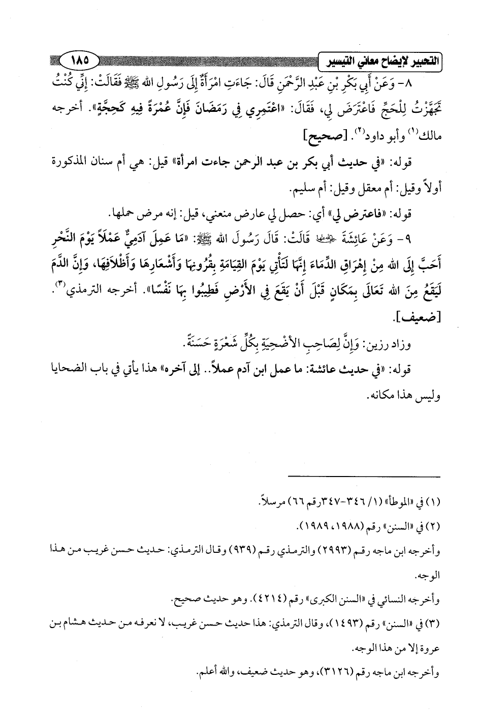 8 - وَعَنْ أَبِي بَكْرِ بْنِ عَبْدِ الرَّحْمَنِ قَالَ: جَاءَتِ امْرَأَةٌ إِلَى رَسُولِ الله - صلى الله عليه وسلم - فَقَالَتْ: إِنِّي كُنْتُ تَجَهَّزْتُ لِلْحَجِّ فَاعْتَرَضَ لِي، فَقَالَ: "اعْتَمِرِي فِي رَمَضَانَ فَإِنَّ عُمْرَةً فِيهِ كَحِجَّةٍ". أخرجه مالك (¬1) وأبو داود (¬2). [صحيح]