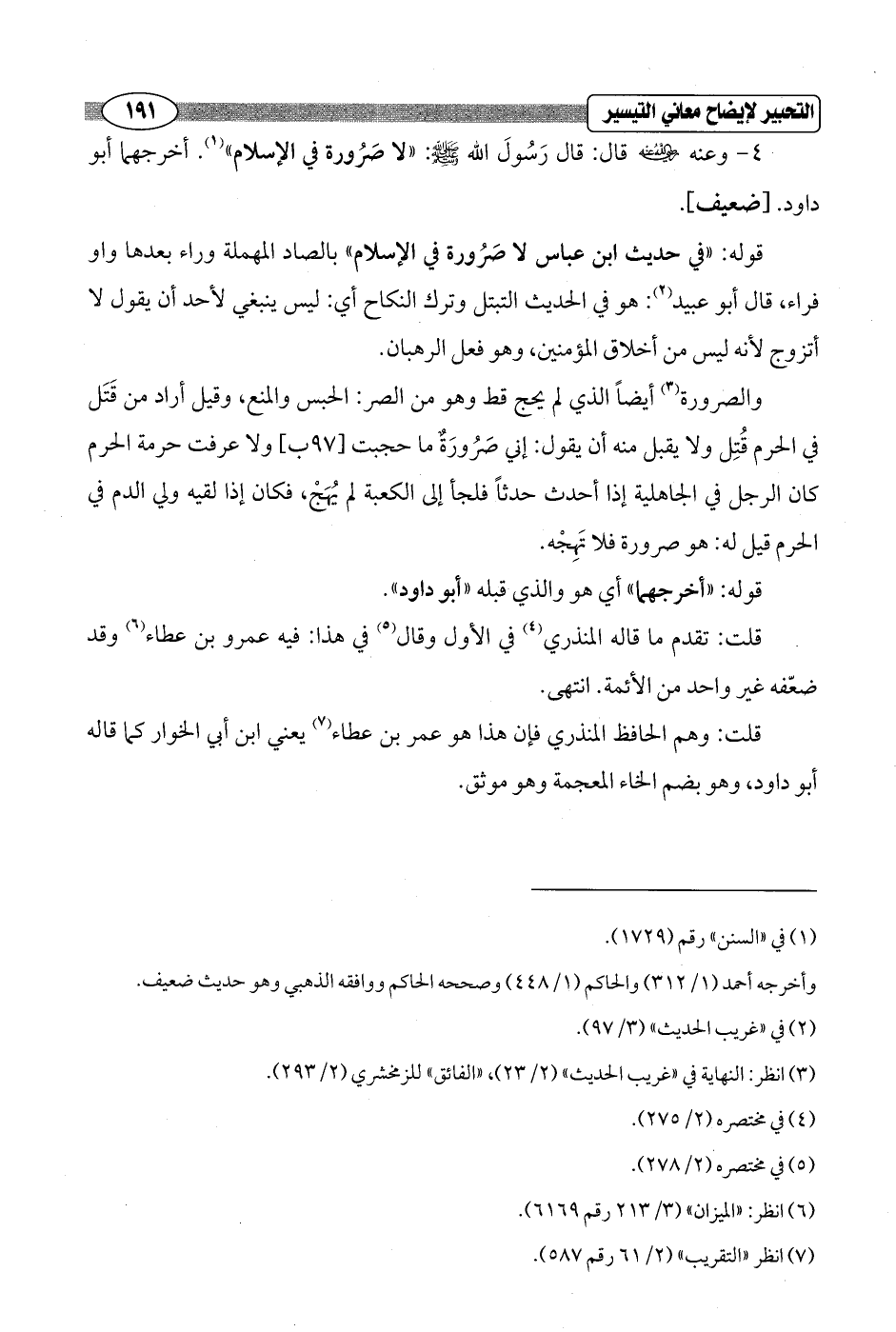 4 - وعنه - رضي الله عنه - قال: قال رَسُولَ الله - صلى الله عليه وسلم -: "لا صَرُورة في الإسلام" (¬1). أخرجهما أبو داود [ضعيف].
