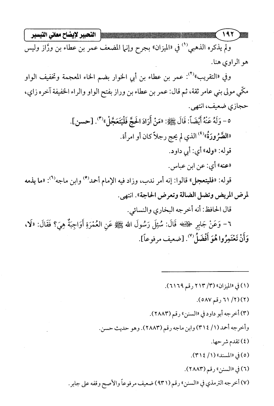 6 - وَعَنْ جَابِر - رضي الله عنه - قَالَ: سُئِلَ رَسُولَ الله - صلى الله عليه وسلم - عَنِ العُمْرَةِ أَوَاجِبَةٌ هِيَ؟ فَقَالَ: "لَا، وَأَنْ تَعْتَمِرُوا هُوَ أَفْضَلُ (¬7). [ضعيف مرفوعاً].