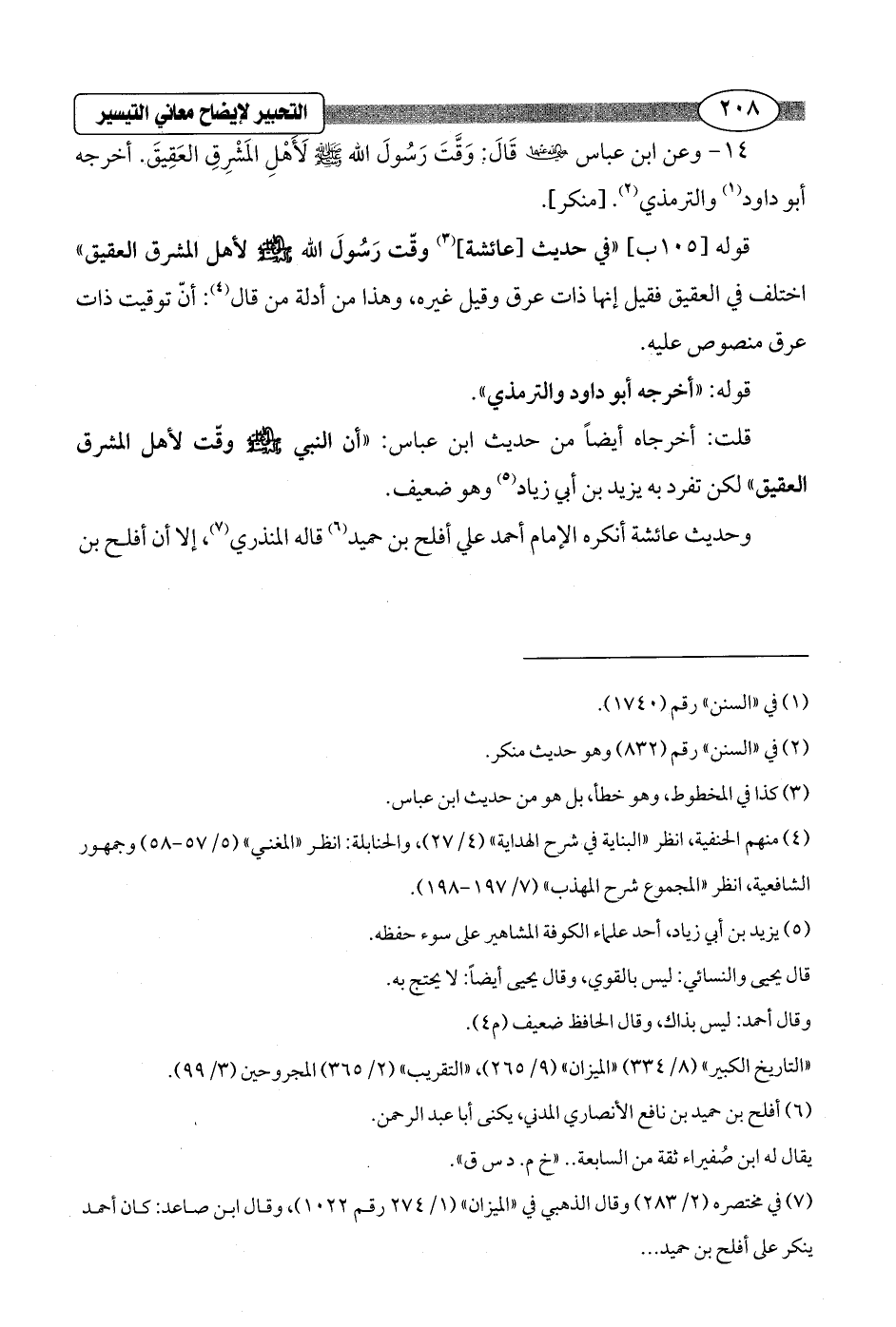 14 - وعن ابن عباس - رضي الله عنهما - قَالَ: وَقَّتَ رَسُولَ الله - صلى الله عليه وسلم - لَأَهْلِ المَشْرِقِ العَقِيقَ. أخرجه أبو داود (¬1) والترمذي (¬2). [منكر].