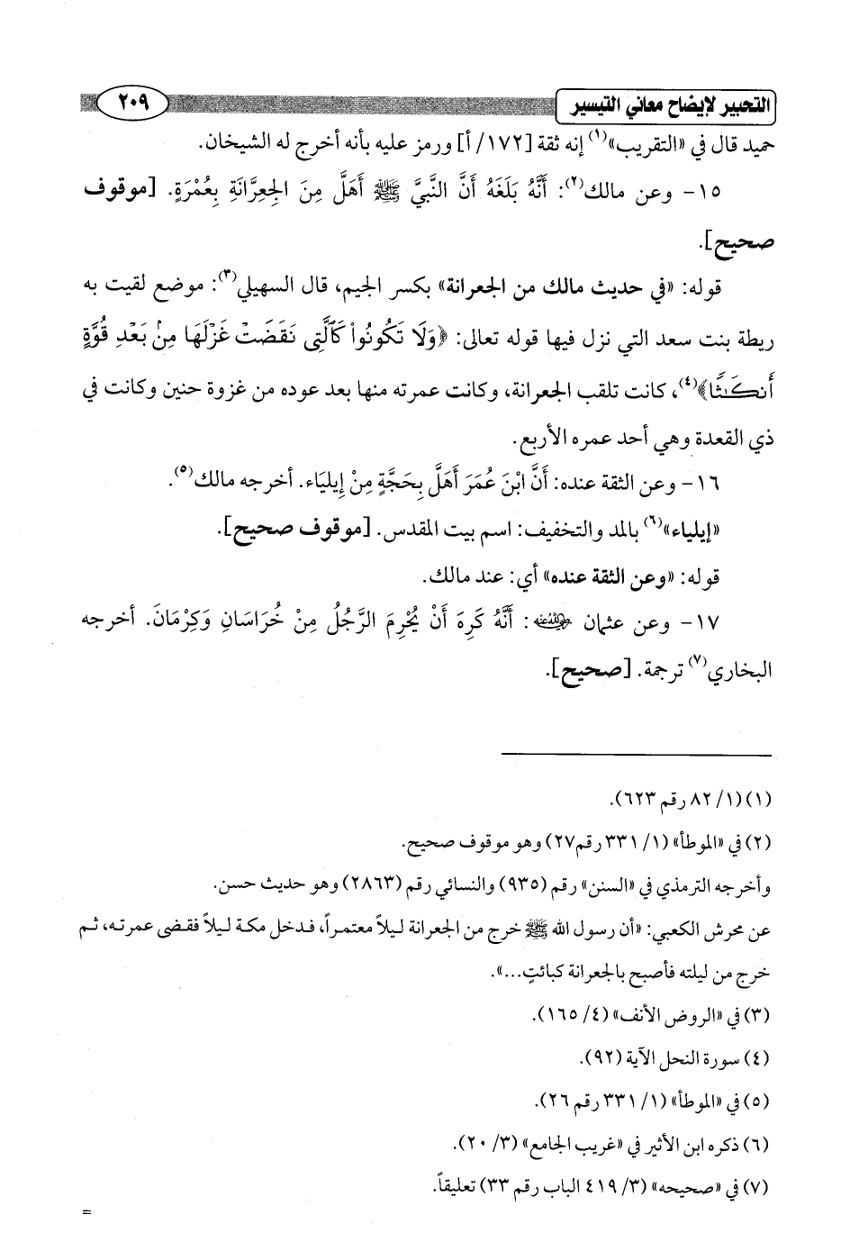 15 - وعن مالك (¬2): أنَّهُ بَلَغَهُ أَنَّ النَّبيَّ - صلى الله عليه وسلم - أَهَلَّ مِنَ الجِعِرَّانَةِ بِعُمْرَةٍ. [موقوف صحيح].