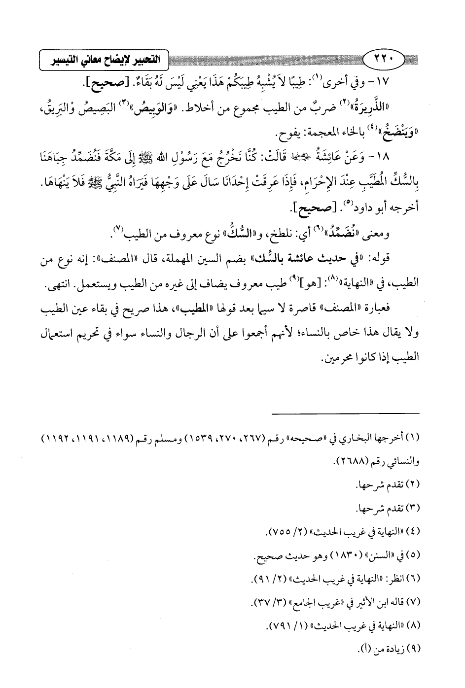 18 - وَعَنْ عَائِشَةُ - رضي الله عنها - قَالَتْ: كُنَّا نَخْرُجُ مَعَ رَسُوْلِ الله - صلى الله عليه وسلم - إِلَى مَكَّةَ فَنُضَمِّدُ جِبَاهَنَا بِالسُّكِّ المُطَيَّبِ عِنْدَ الإِحْرَامِ، فَإِذَا عَرِقَتْ إِحْدَانَا سَالَ عَلَى وَجْهِهَا فَيَرَاهُ النَّبِيُّ - صلى الله عليه وسلم - فَلاَ يَنْهَاهَا. أخرجه أبو داود (¬5). [صحيح].