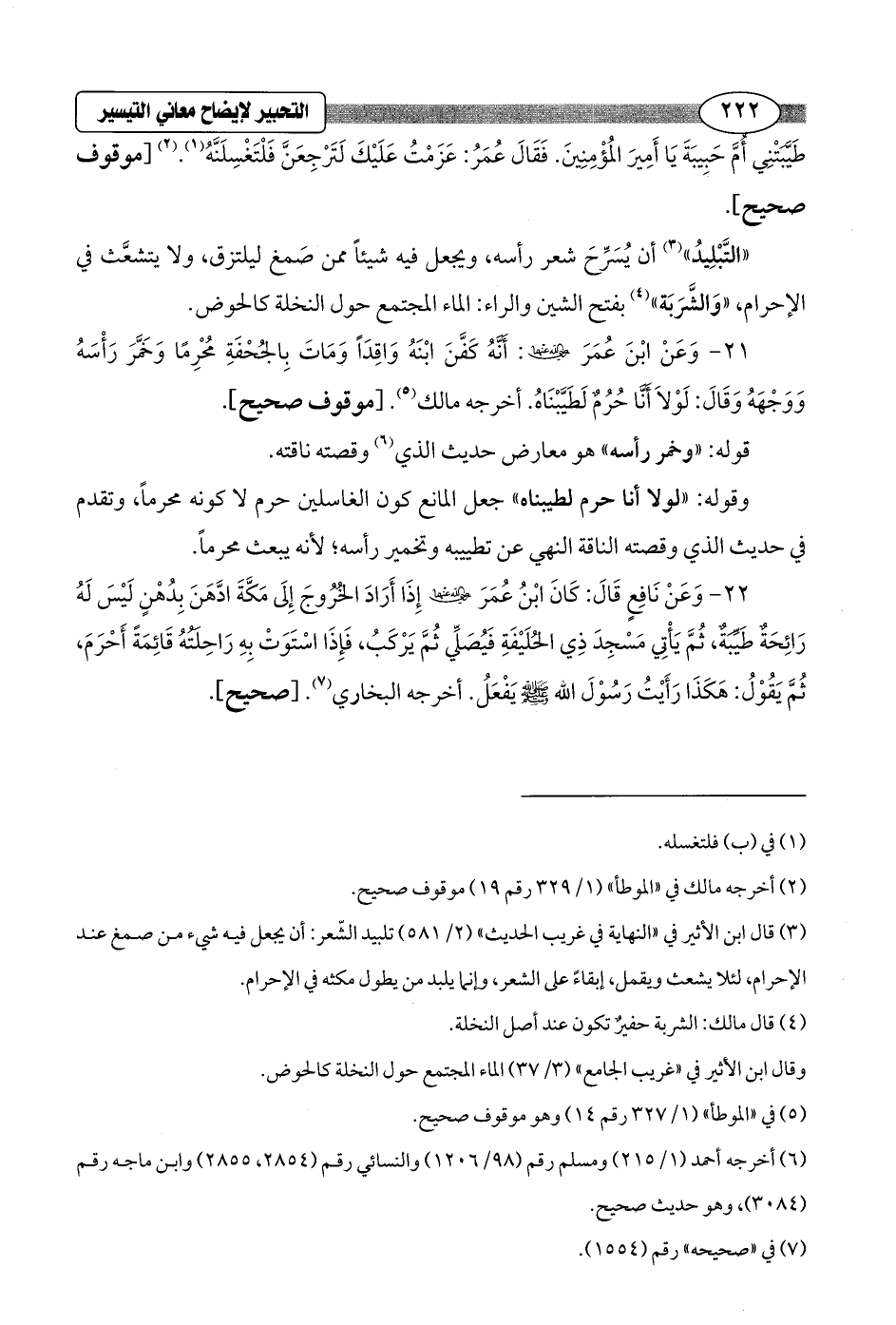 22 - وَعَنْ نَافِعٍ قَالَ: كَانَ ابْنُ عُمَرَ - رضي الله عنهما - إِذَا أَرَادَ الخُرُوجَ إِلَى مَكَّةَ ادَّهَنَ بِدُهْنٍ لَيْسَ لَهُ رَائِحَةٌ طَيِّبَةٌ، ثُمَّ يَأْتِي مَسْجِدَ ذِي الحُلَيْفَةِ فَيُصَلِّي ثُمَ يَرْكَبُ، فَإِذَا اسْتَوَتْ بِهِ رَاحِلَتُهُ قَائِمَةً أَحْرَمَ، ثُمَّ يَقُوْلُ: هَكَذَا رَأَيْتُ رَسُوْلَ الله - صلى الله عليه وسلم - يَفْعَلُ. أخرجه البخاري (¬7). [صحيح].