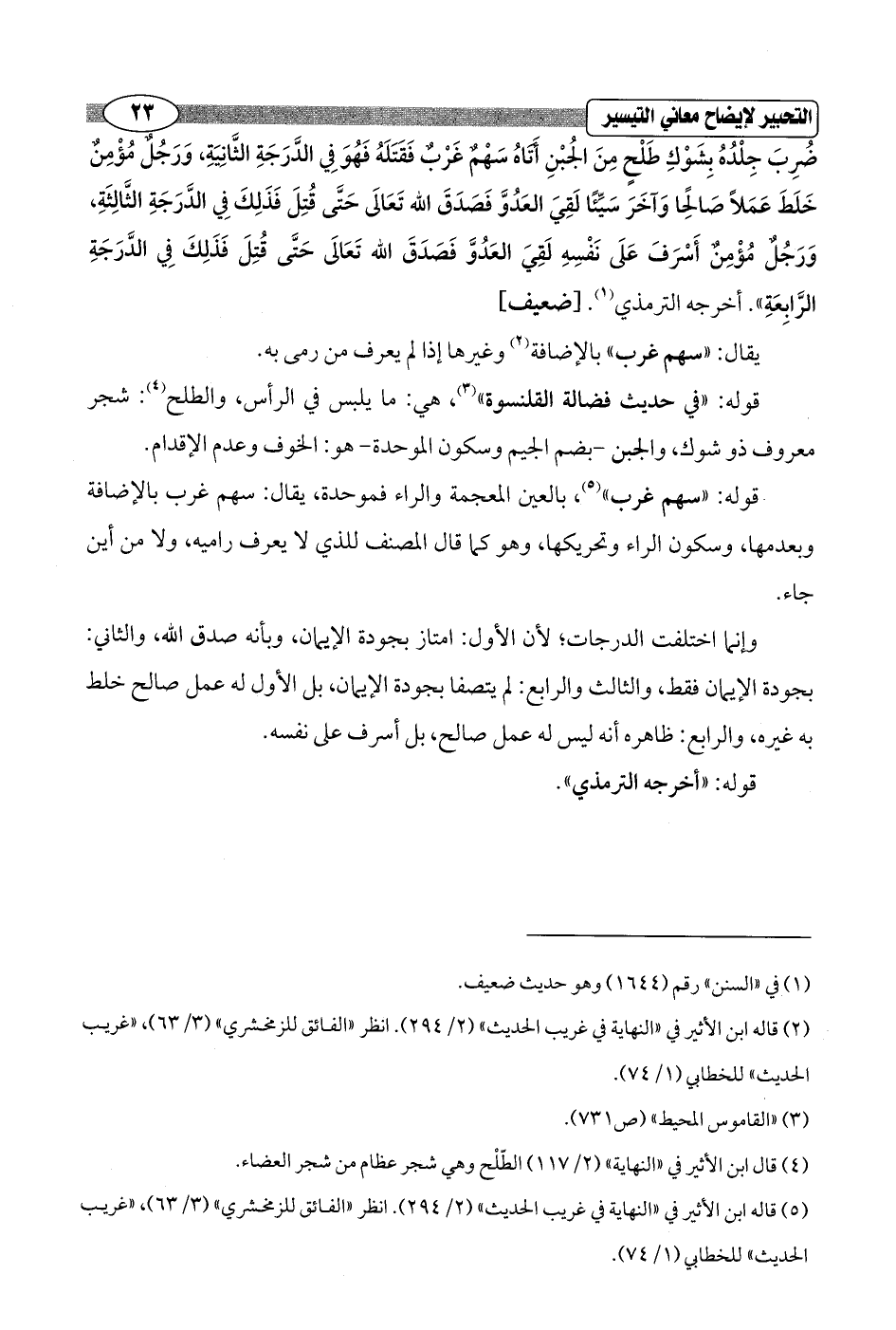 ضُرِبَ جِلْدُهُ بِشَوْكِ طَلْحٍ مِنَ الجُبْنِ أَتَاهُ سَهْمٌ غَرْبٌ فَقَتَلَهُ فَهُوَ فِي الدَّرَجَةِ الثَّانِيَة, وَرَجُلٌ مُؤْمِنٌ خَلَطَ عَمَلاً صَالحِاً وَآخَرَ سَيِّئًا لَقِيَ العَدُوَّ فَصَدَقَ الله تَعَالَى حَتَّى قُتِلَ فَذَلِكَ فِي الدَّرَجَةِ الثَّالِثَةِ، وَرَجُلٌ مُؤْمِنٌ أَسْرَفَ عَلَى نَفْسِهِ لَقِيَ العَدُوَّ فَصَدَقَ الله تَعَالَى حَتَّى قُتِلَ فَذَلِكَ فِي الدَّرَجَةِ الرَّابِعَةِ". أخرجه الترمذي (¬1). [ضعيف]