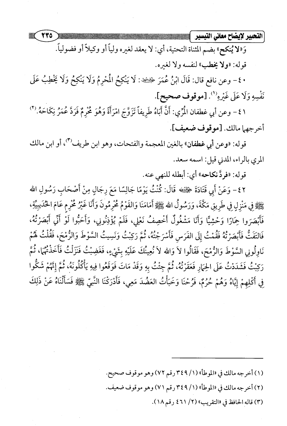 41 - وعن أبي غطفان المُرِّي: أَنَّ أَبَاهُ طَرِيفاً تَزَوَّجَ امْرَأَةً وَهُوَ مُحْرِمٌ فَرَدَّ عُمَرُ نِكَاحَهُ. (¬2) أخرجهما مالك. [موقوف ضعيف].