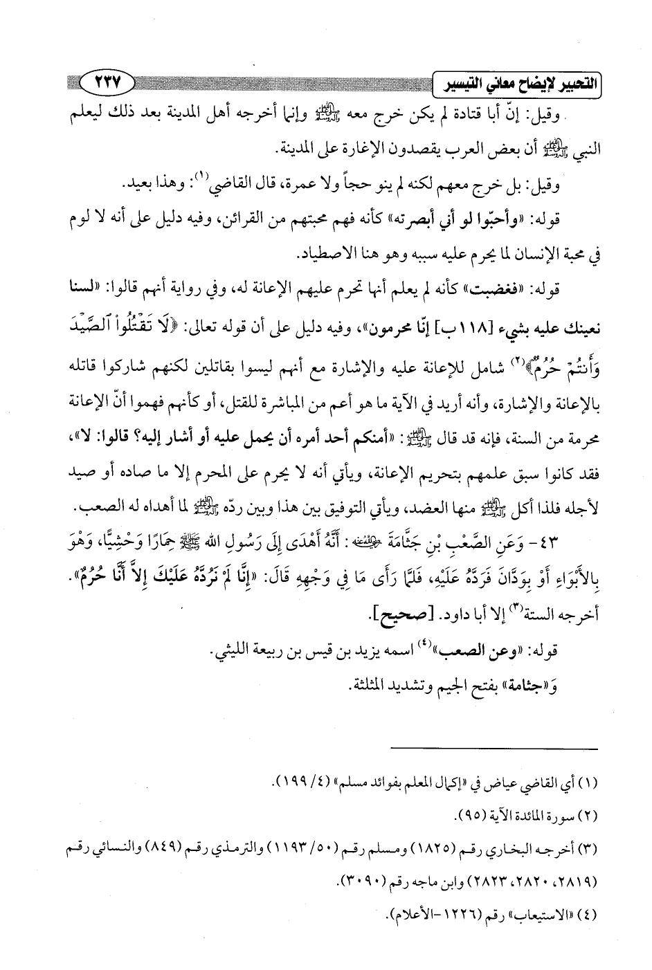 43 - وَعَنِ الصَّعْبِ بْنِ جَثَّامَةَ - رضي الله عنه -: أَنَّهُ أَهْدَى إِلَى رَسُولِ الله - صلى الله عليه وسلم - حِمَارًا وَحْشِيًّا، وَهْوَ بِالأَبْوَاءِ أَوْ بِوَدَّانَ فَرَدَّهُ عَلَيْهِ، فَلمَّا رَأَى مَا فِي وَجْهِهِ قَالَ: "إِنَّا لَمْ نَرُدَّهُ عَلَيْكَ إِلاَّ أَنَّا حُرُمٌ". أخرجه الستة (¬3) إلا أبا داود. [صحيح].