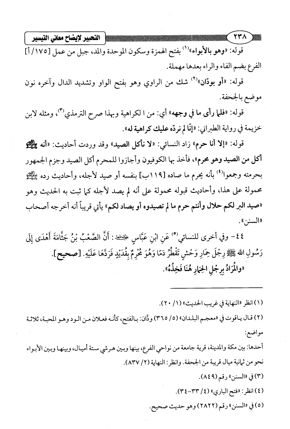 44 - وفي أخرى للنسائي (¬5) عَنِ ابْنِ عَبَّاسٍ - رضي الله عنهما -: أَنَّ الصَّعْبُ بْنُ جَثَّامَةَ أَهْدَى إِلَى رَسُولِ الله - صلى الله عليه وسلم - رِجْلَ حِمَارِ وَحْشٍ تَقْطُرُ دَمًا وَهُوَ مُحْرِمٌ بِقُدَيْدٍ فَرَدَّهَا عَلَيْهِ. [صحيح].