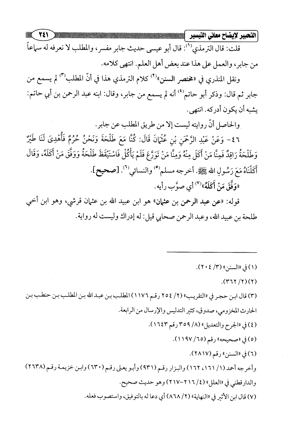 ونقل المنذري في "مختصر السنن" (¬2) كلام الترمذي هذا في أنّ المطلب (¬3) لم يسمع من جابر ثم قال: وذكر أبو حاتم (¬4) أنه لم يسمع من جابر، وقال: ابنه عبد الرحمن بن أبي حاتم: يشبه أن يكون أدركه. انتهى.