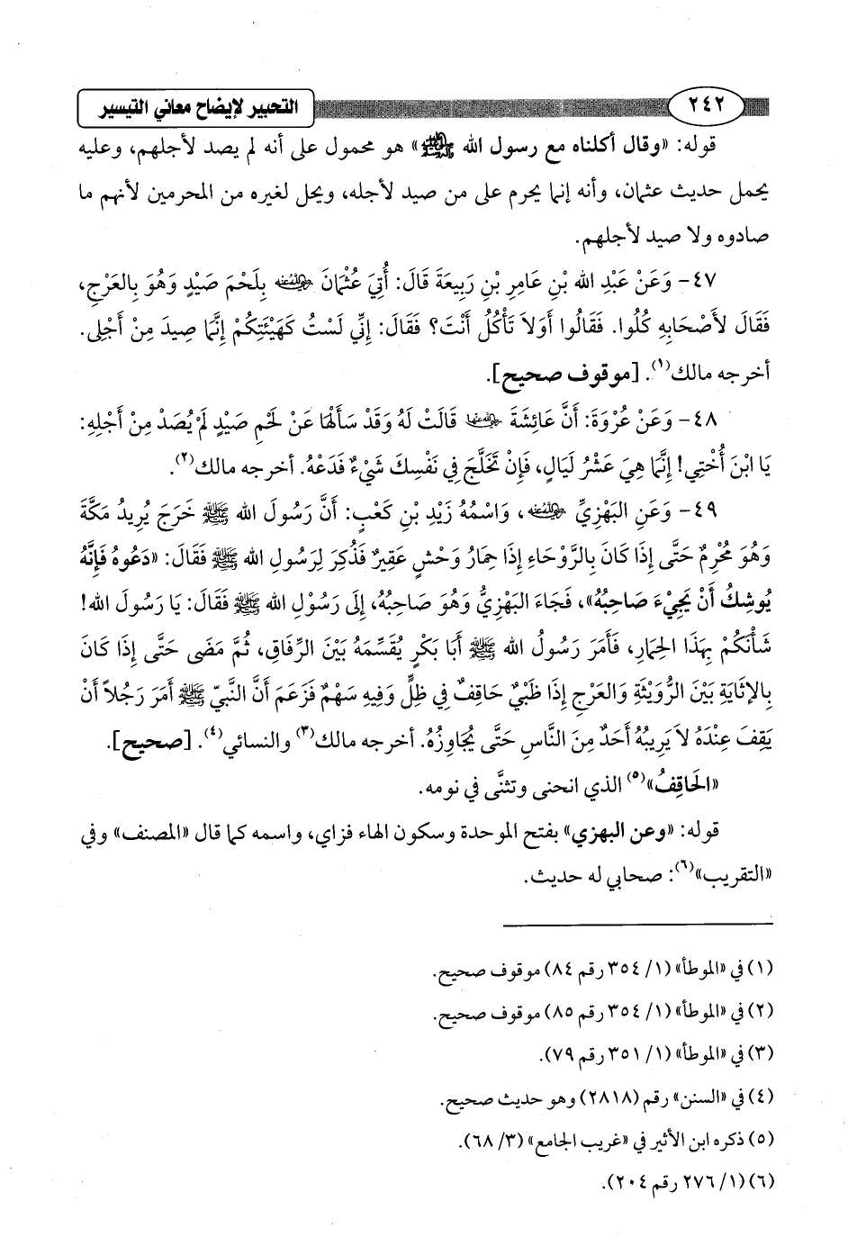 49 - وَعَنِ البَهْزِيِّ - رضي الله عنه -، وَاسْمُهُ زَيْدِ بْنِ كَعْبٍ: أَنَّ رَسُولَ الله - صلى الله عليه وسلم - خرَجَ يُرِيدُ مَكَّةَ وَهو مُحْرِمٌ حَتَّى إِذَا كَانَ بِالرَّوْحَاءِ إِذَا حِمَارُ وَحْشٍ عَقِيرٌ فَذُكِرَ لِرَسُولِ الله - صلى الله عليه وسلم - فَقَالَ: "دَعُوهُ فَإِنَّهُ يُوشِكُ أَنْ يَجِيْءَ صَاحِبُهُ"، فَجَاءَ البَهْزِيُّ وَهُوَ صَاحِبُهُ، إِلَى رَسُوْلِ الله - صلى الله عليه وسلم - فَقَالَ: يَا رَسُولَ الله! شَأْنَكُمْ بِهَذَا الحِمَارِ، فَأَمَرَ رَسُولُ الله - صلى الله عليه وسلم - أبا بَكْرٍ يُقَسِّمَهُ بَيْنَ الرِّفَاقِ، ثُمَّ مَضَى حَتَّى إِذَا كَانَ بِالإثَايَةِ بَيْنَ الرُّوَيْثَةِ وَالعَرْجِ إِذَا ظَبْيٌ حَاقِفٌ فِي ظِلٍّ وَفِيهِ سَهْمٌ فَزَعَمَ أَنَّ النَّبيّ - صلى الله عليه وسلم - أَمَرَ رَجُلاً أَنْ يَقِفَ عِنْدَهُ لاَ يَرِيبُهُ أَحَدٌ مِنَ النَّاسِ حَتَّى يُجَاوِزُهُ. أخرجه مالك (¬3) والنسائي (¬4). [صحيح].