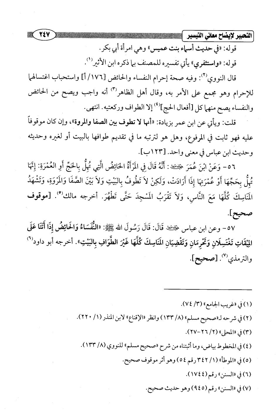 قلت: ويأتي عن ابن عمر بزيادة: "أنها لا تطوف بين الصفا والمروة"، وإن كان موقوفاً عليه فهو ثابت في المرفوع، وهل هو لترتبه ما في تقديم طوافها بالبيت أو لغيره وحديثه وحديث ابن عباس في معنى واحد. [123 ب].