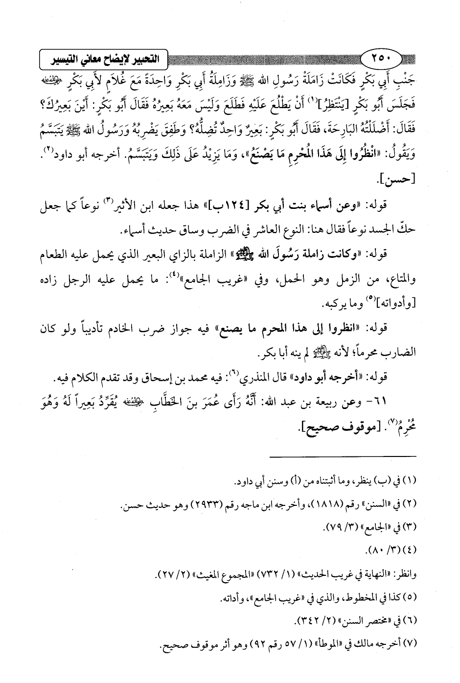 فَقَالَ: أَضلَلْتُهُ البَارِحَةَ، فَقَالَ أبُو بَكْرٍ: بَعِيرٌ وَاحِدٌ تُضِلُّهُ؟ وَطَفِقَ يَضْرِبُهُ وَرَسُولُ الله - صلى الله عليه وسلم - يَتبَسَّمُ وَيَقُولُ: "انْظُرُوا إِلَى هَذَا المُحْرِمِ مَا يَصْنَعُ"، وَمَا يَزِيْدُ عَلَى ذَلِكَ وَيَتَبَسَّمُ. أخرجه أبو داود (¬2). [حسن].