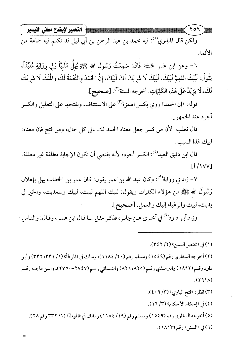 6 - وعن ابن عمر - رضي الله عنهما - قَالَ: سَمِعْتُ رَسُولَ اللهِ - صلى الله عليه وسلم - يُهِلُّ مُلَبِيَّاً وَفِي رِوَايَةٍ مُلَبِّدَاً، يَقُولُ: لَبَّيْكَ اللهمَّ لَبَّيْكَ، لَبَّيْكَ لَا شَرِيْكَ لَكَ لَبَّيْكَ، إِنَّ الحَمْدَ وِالنِّعْمَةَ لَكَ والمُلْكَ لَا شَرِيْك لَكَ، لَا يَزِيْدُ عَلَى هَذ الكَلِمَاتِ. أخرجه الستة (¬2). [صحيح].