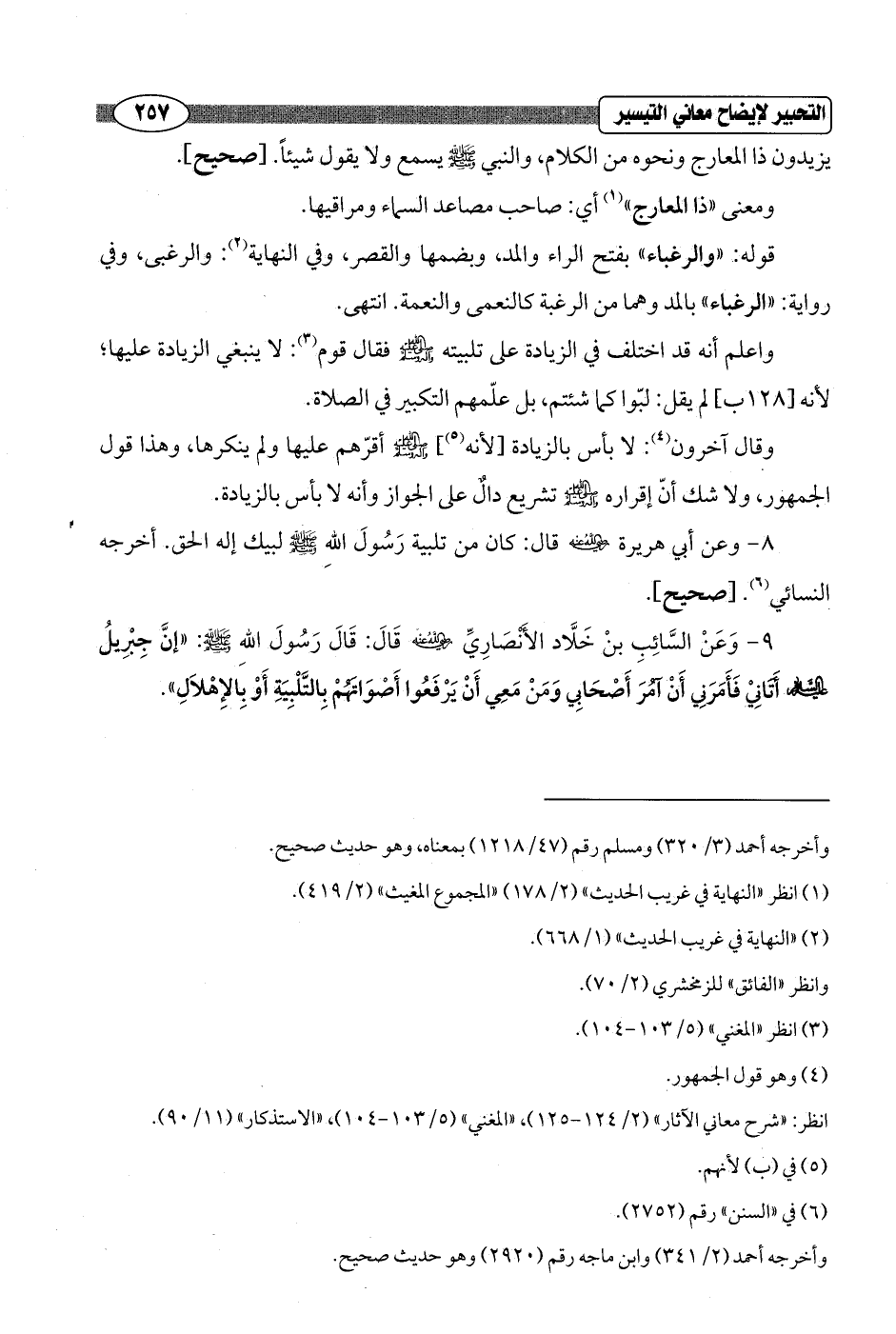 8 - وعن أبي هريرة - رضي الله عنه - قال: كان من تلبية رَسُولَ اللهِ - صلى الله عليه وسلم - لبيك إله الحق. أخرجه النسائي (¬6). [صحيح].