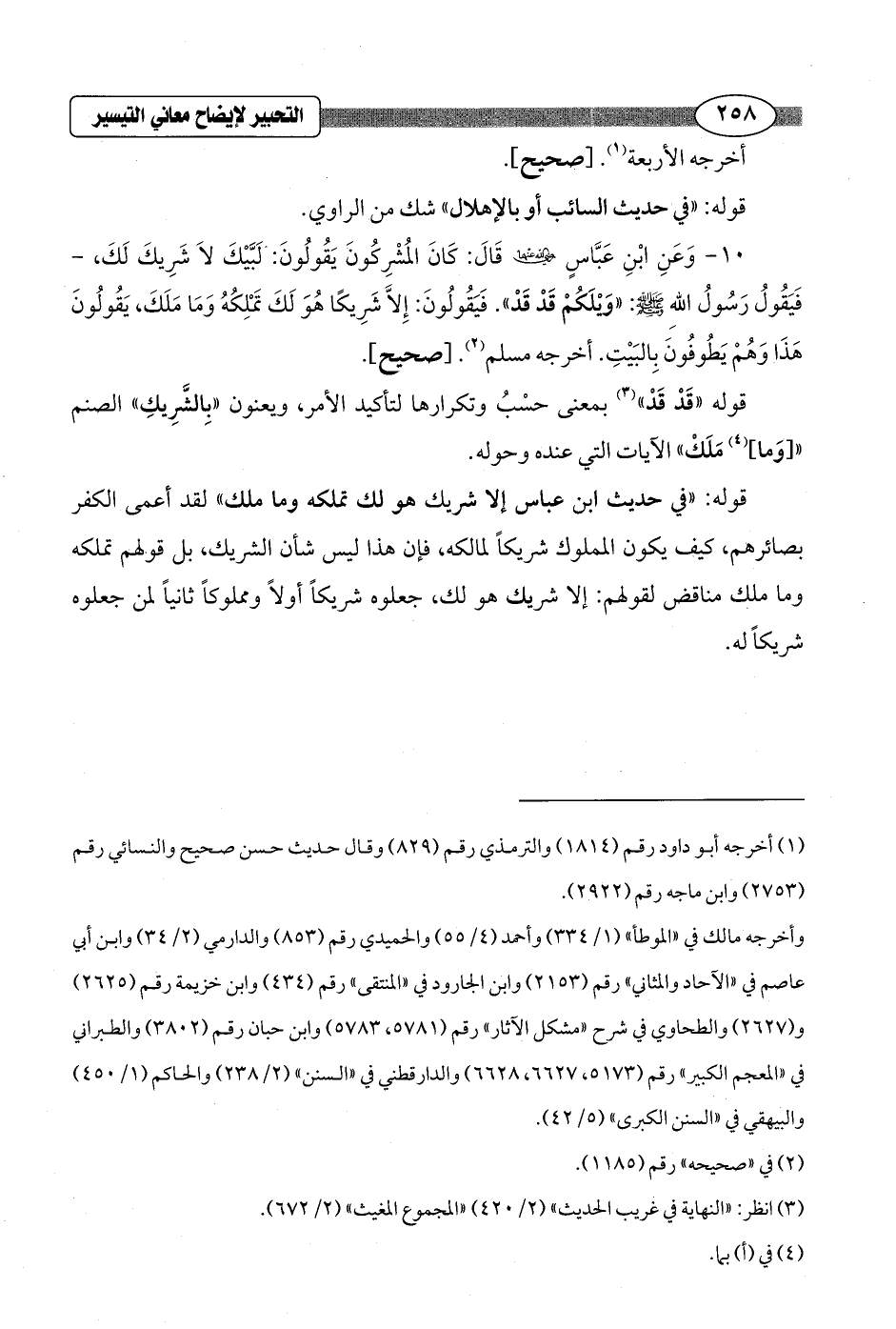 10 - وَعَنِ ابْنِ عَبَّاسٍ - رضي الله عنهما - قَالَ: كَانَ المُشْرِكُونَ يَقُولُونَ: لَبَّيْكَ لاَ شَرِيكَ لَكَ، - فَيَقُولُ رَسُولُ اللهِ - صلى الله عليه وسلم -: "وَيْلَكُمْ قَدْ قَدْ". فَيَقُولُونَ: إِلاَّ شَرِيكًا هُوَ لَكَ تَمْلِكُهُ وَمَا مَلَكَ، يَقُولُونَ هَذَا وَهُمْ يَطُوفُونَ بِالبَيْتِ. أخرجه مسلم (¬2). [صحيح].