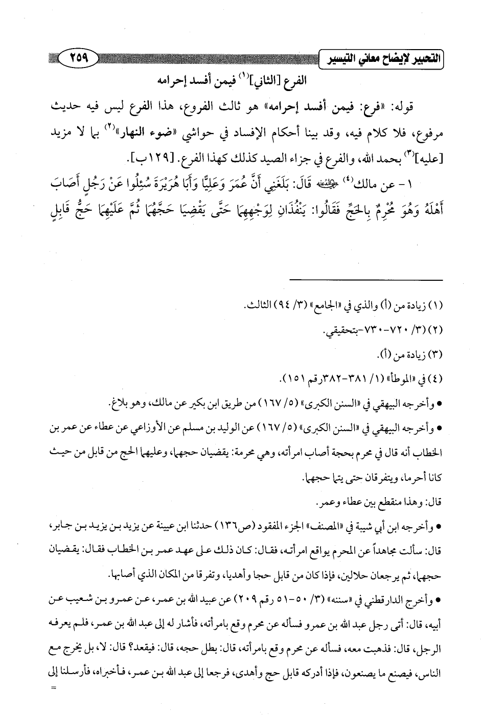 قوله: "فرع: فيمن أفسد إحرامه" هو ثالث الفروع، هذا الفرع ليس فيه حديث مرفوع، فلا كلام فيه، وقد بينا أحكام الإفساد في حواشي "ضوء النهار" (¬2) بما لا مزيد [عليه] (¬3) بحمد الله، والفرع في جزاء الصيد كذلك كهذا الفرع. [129 ب].
