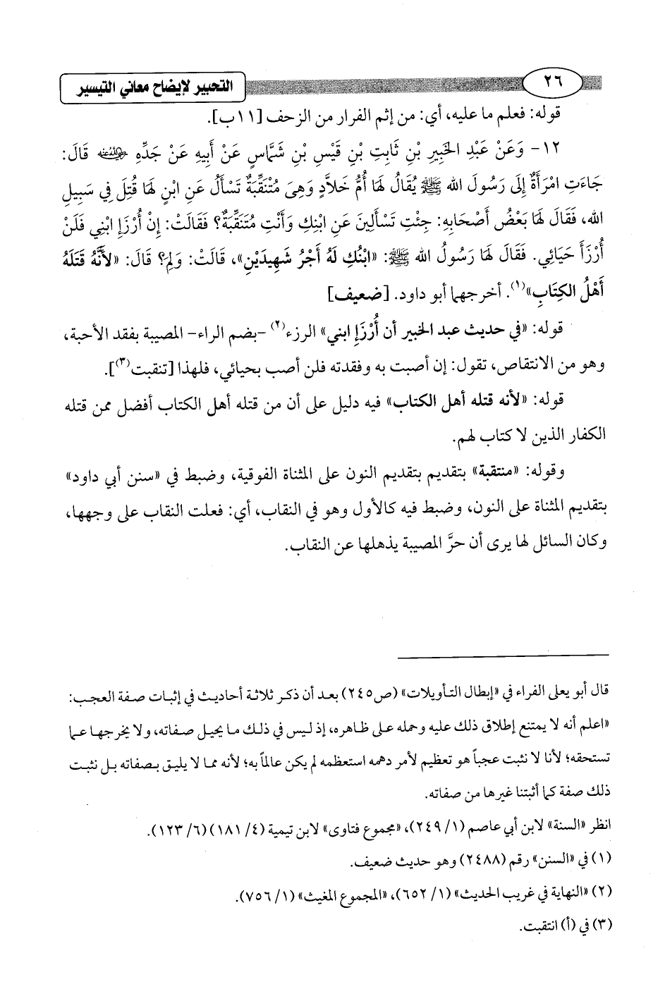 12 - وَعَنْ عَبْدِ الخَبِيرِ بْنِ ثَابِتِ بْنِ قَيْسِ بْنِ شَمَّاسٍ عَنْ أَبِيهِ عَنْ جَدِّهِ - رضي الله عنه - قَالَ: جَاءَتِ امْرَأَةٌ إِلَى رَسُولَ الله - صلى الله عليه وسلم - يُقَالُ لَهَا أُمُّ خَلاَّدٍ وَهِىَ مُتْنَقِّبَةٌ تَسْأَلُ عَنِ ابْنٍ لَهَا قُتِلَ فِي سَبِيلِ الله، فَقَالَ لَهَا بَعْضُ أَصْحَابِهِ: جِئْتِ تَسْأَلِينَ عَنِ ابْنِكِ وَأَنْتِ مُتَنَقِّبَةٌ؟ فَقَالَتْ: إِنْ أُرْزَإِ ابْنِي فَلَنْ أُرْزَأَ حَيَائِي. فَقَالَ لَهَا رَسُولُ الله - صلى الله عليه وسلم -: "ابْنُكِ لَهُ أَجْرُ شَهِيدَيْنِ"، قَالَتْ: وَلِمَ؟ قَالَ: "لأَنَّه قَتَلَهُ أَهْلُ الكِتَابِ" (¬1). أخرجهما أبو داود. [ضعيف]