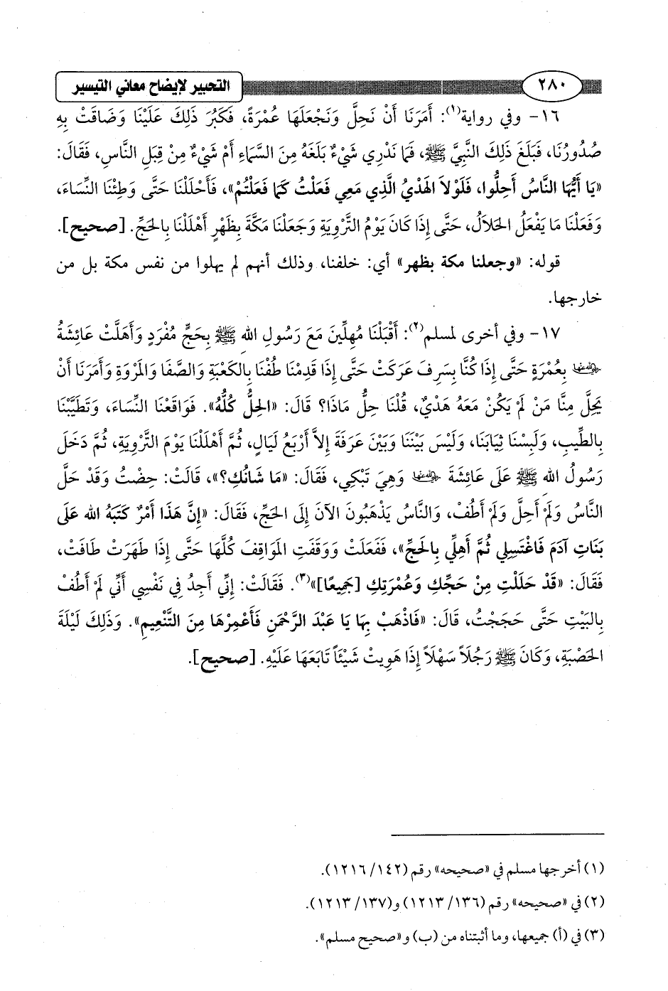 17 - وفي أخرى لمسلم (¬2): أَقْبَلْنَا مُهِلِّينَ مَعَ رَسُولِ الله - صلى الله عليه وسلم - بِحَجٍّ مُفْرَدٍ وَأَهَلَّتْ عَائِشَةُ - رضي الله عنها - بِعُمْرَةٍ حَتَّى إِذَا كُنَّا بِسَرِفَ عَرَكَتْ حَتَّى إِذَا قَدِمْنَا طُفْنَا بِاَلكَعْبَةِ وَالصَّفَا وَالمَرْوَةِ وَأَمَرَنَا أَنْ يَحِلَّ مِنَّا مَنْ لَمْ يَكُنْ مَعَهُ هَدْيٌ، قُلْنَا حِلُّ مَاذَا؟ قَالَ: "الحِلُّ كُلُّهُ". فَوَاقَعْنَا النِّسَاءَ، وَتَطَيَّبْنَا بِالطِّيبِ، وَلَبِسْنَا ثِيَابَنَا، وَلَيْسَ بَيْنَنَا وَبَيْنَ عَرَفَةَ إِلاَّ أَرْبَعُ لَيَالٍ، ثُمَّ أَهْلَلْنَا يَوْمَ التَّرْوِيَةِ، ثُمَّ دَخَلَ رَسُولُ اللهِ - صلى الله عليه وسلم - عَلَى عَائِشَةَ - رضي الله عنها - وَهِيَ تَبْكِي، فَقَالَ: "مَا شَانُكِ؟ "، قَالَتْ: حِضْتُ وَقَدْ حَلَّ النَّاسُ وَلَمْ أَحِلَّ وَلَمْ أَطُفْ، وَالنَّاسُ يَذْهَبُونَ الآنَ إِلَى الحَجِّ، فَقَالَ: "إِنَّ هَذَا أَمْرٌ كَتَبَهُ الله عَلَى بَنَاتِ آدَمَ فَاغْتَسِلِي ثُمَّ أَهِلِّي بِالحَجِّ"، فَفَعَلَتْ وَوَقَفَتِ المَوَاقِفَ كُلَّهَا حَتَّى إِذَا طَهَرَتْ طَافَتْ، فَقَالَ: "قَدْ حَلَلْتِ مِنْ حَجِّكِ وَعُمْرَتِكِ [جَمِيعًا] " (¬3). فَقَالَتْ: إِنِّي أَجِدُ فِي نَفْسِي أَنِّي لَمْ أَطُفْ بِالبَيْتِ حَتَّى حَجَجْتُ، قَالَ: "فَاذْهَبْ بِهَا يَا عَبْدَ الرَّحْمَنِ فَأَعْمِرْهَا مِنَ التَّنْعِيمِ". وَذَلِكَ لَيْلَةَ الحَصْبَةِ، وَكَانَ - صلى الله عليه وسلم - رَجُلَاً سَهْلَاً إِذَا هَوِيتْ شَيْئَاً تَابَعَهَا عَلَيْهِ. [صحيح].