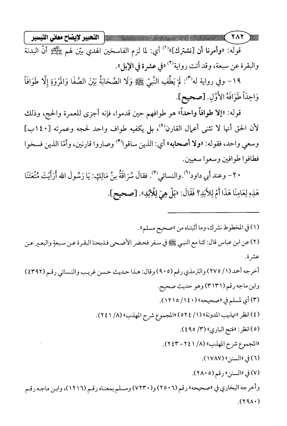19 - وفي رواية له (¬3): لَمْ يَطُفِ النَّبيّ - صلى الله عليه وسلم - وَلَا الصَّحَابَةُ بَيْنَ الصَّفَا وَالمَرْوَةِ إِلَّا طَوَافَاً وَاحِدَاً طَوَافَهُ الأَوَّلِ. [صحيح].