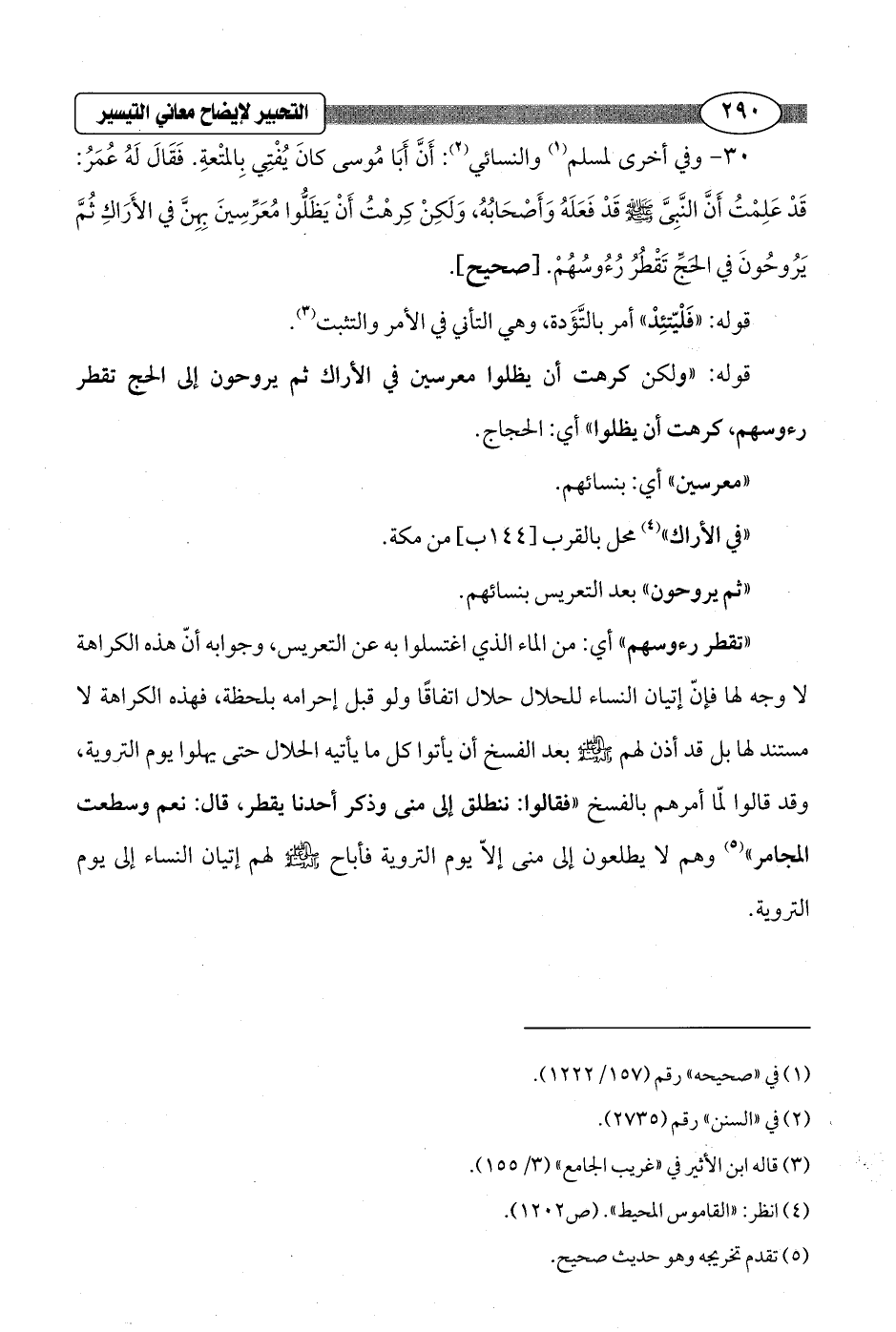 "تقطر رءوسهم" أي: من الماء الذي اغتسلوا به عن التعريس، وجوابه أنّ هذه الكراهة لا وجه لها فإنّ إتيان النساء للحلال حلال اتفاقًا ولو قبل إحرامه بلحظة، فهذه الكراهة لا مستند لها بل قد أذن لهم - صلى الله عليه وسلم - بعد الفسخ أن يأتوا كل ما يأتيه الحلال حتى يهلوا يوم التروية، وقد قالوا لمّا أمرهم بالفسخ "فقالوا: ننطلق إلى منى وذكر أحدنا يقطر، قال: نعم وسطعت المجامر" (¬5) وهم لا يطلعون إلى منى إلاّ يوم التروية فأباح - صلى الله عليه وسلم - لهم إتيان النساء إلى يوم التروية.