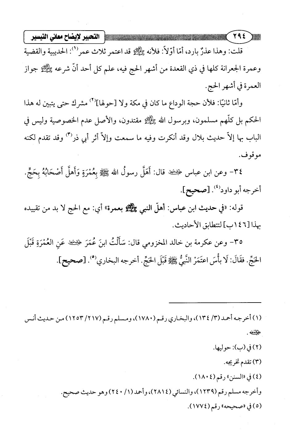 قلت: وهذا عذرٌ بارد، أمّا أوّلاً: فلأنه - صلى الله عليه وسلم - قد اعتمر ثلاث عمر (¬1): الحديبية والقضية وعمرة الجعرانة كلها في ذي القعدة من أشهر الحج فيمن علم كل أحد أنّ شرعه - صلى الله عليه وسلم - جواز العمرة في أشهر الحج.