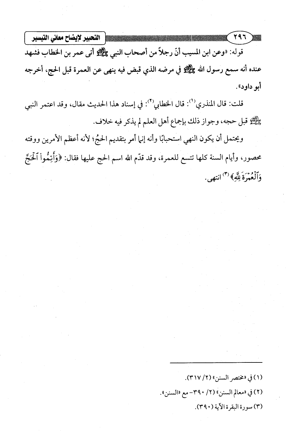 ويحتمل أن يكون النهي استحباباً وأنه إنما أمر بتقديم الحجُ؛ لأنه أعظم الأمرين ووقته محصور، وأيام السنة كلها تتسع للعمرة، وقد قدّم الله اسم الحج عليها فقال: {وَأَتِمُّوا الْحَجَّ وَالْعُمْرَةَ لِلَّهِ} (¬3) انتهى.
