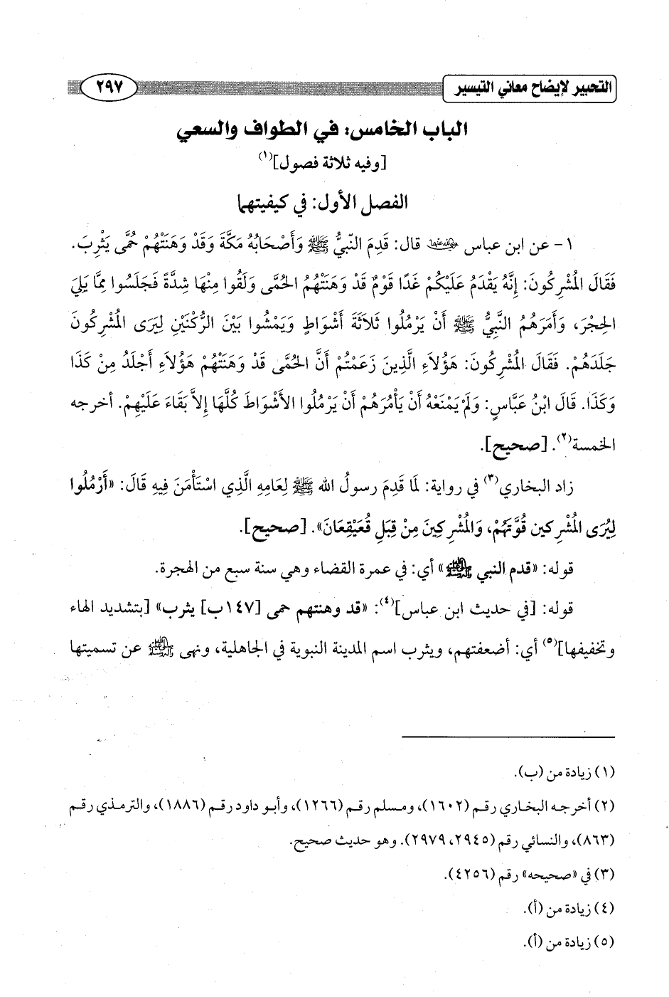 1 - عن ابن عباس - رضي الله عنهما - قال: قَدِمَ النّبيُّ - صلى الله عليه وسلم - وَأَصْحَابُهُ مَكَّةَ وَقَدْ وَهَنَتْهُمْ حُمَّى يَثْرِبَ. فَقَالَ المُشْرِكُونَ: إِنَّهُ يَقْدَمُ عَلَيْكُمْ غَدًا قَوْمٌ قَدْ وَهَنَتْهُمُ الحُمَّى وَلَقُوا مِنْهَا شِدَّةً فَجَلَسُوا مِمَّا يَليَ الحِجْرَ، وَأَمَرَهُمُ النَّبِيُّ - صلى الله عليه وسلم - أَنَّ يَرْمُلُوا ثَلاَثَةَ أَشْوَاطٍ وَيَمْشُوا بَيْنَ الرُّكْنَيْنِ لِيَرَى المُشْرِكُونَ جَلَدَهُمْ. فَقَالَ المُشْرِكُونَ: هَؤُلاَءِ الَّذِينَ زَعَمْتُمْ أَنَّ الحُمَّى قَدْ وَهَنَتْهُمْ هَؤُلاَءِ أَجْلَدُ مِنْ كَذَا وَكَذَا. قَالَ ابْنُ عَبَّاسٍ: وَلَمْ يَمْنَعْهُ أَنْ يَأْمُرَهُمْ أَنْ يَرْمُلُوا الأَشْوَاطَ كُلَّهَا إِلاَّ بَقَاءَ عَلَيْهِمْ. أخرجه الخمسة (¬2). [صحيح].