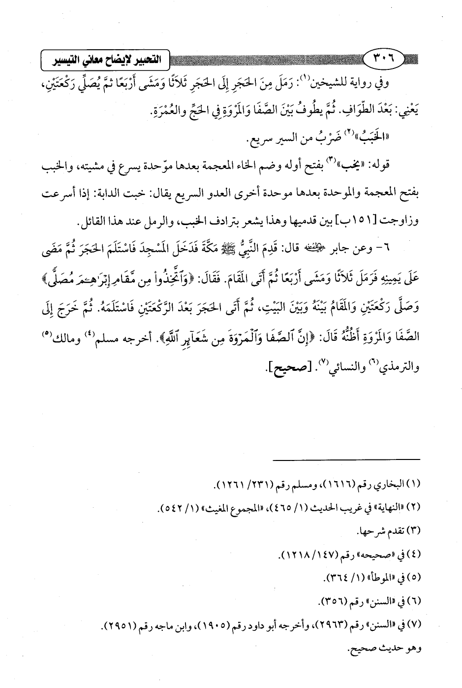 6 - وعن جابر - رضي الله عنه - قال: قَدِمَ النَّبِيُّ - صلى الله عليه وسلم - مَكَّةَ فَدَخَلَ المَسْجِدَ فَاسْتَلَمَ الحَجَرَ ثُمَّ مَضَى عَلَى يَمِينِهِ فَرَمَلَ ثَلاَثًا وَمَشَى أَرْبَعًا ثُمَّ أتى المَقَامَ. فَقَالَ: {وَاتَّخِذُوا مِنْ مَقَامِ إِبْرَاهِيمَ مُصَلًّى} وَصَلَّى رَكْعَتَيْنِ وَالمَقَامُ بَيْنَهُ وَبَيْنَ البَيْتِ، ثُمَّ أَتَى الحَجَرَ بَعْدَ الرَّكْعَتَيْنِ فَاسْتَلَمَهُ. ثُمَّ خَرَجَ إِلَى الصَّفَا وَالمَرْوَةِ أَظُنُّهُ قَالَ: {إِنَّ الصَّفَا وَالْمَرْوَةَ مِنْ شَعَائِرِ اللَّهِ}. أخرجه مسلم (¬4) ومالك (¬5) والترمذي (¬6) والنسائي (¬7). [صحيح].